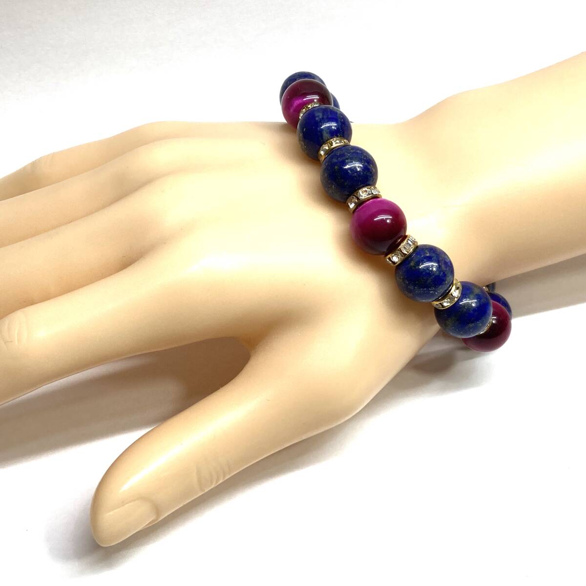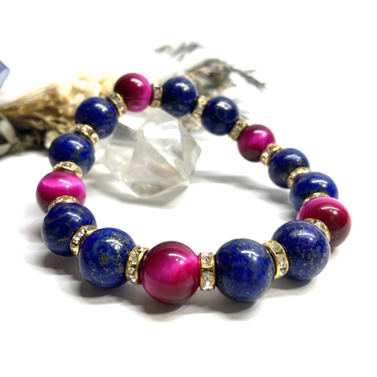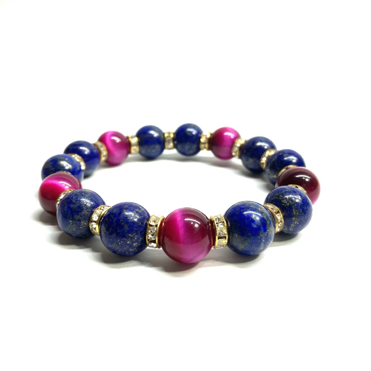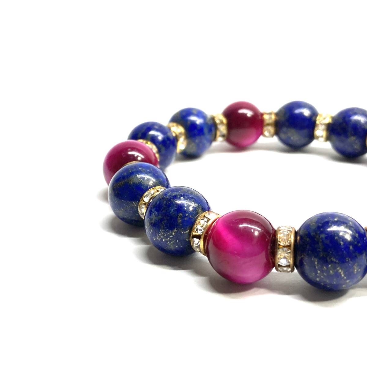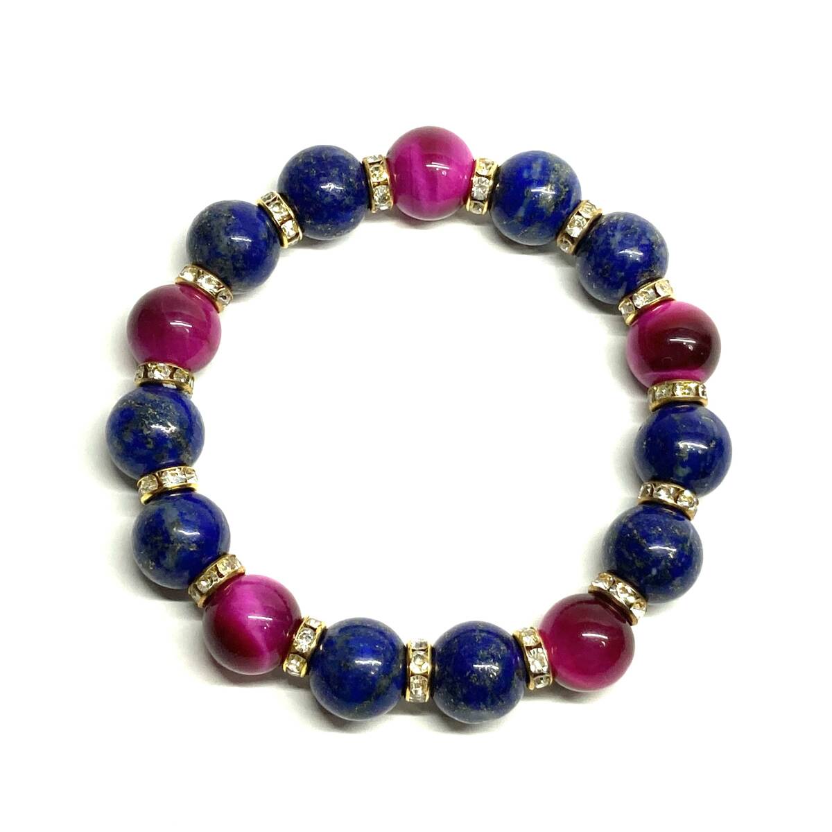 こちらは、ラピスラズリとピンクタイガーアイを組み合わせたパワーストーンブレスレットです。間にはロンデルを挟み高級感あるデザインに仕上げております。程よくインパクトがある12mm玉を使用して内周約18cmです。(サイズ変更の場合は取引ナビにてご連絡をお願いします。) 数に限りがございますので気になる方はお早めにどうぞ。