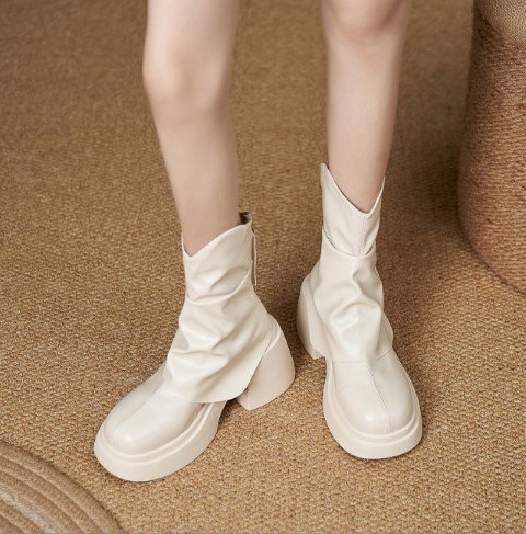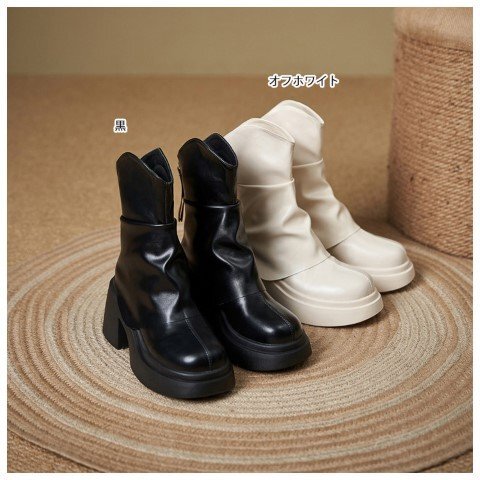 レディース 靴 ショートブーツ バックファスナー レザー調 厚底 秋冬 脚長 美脚 黒 ブラック 22.5cm(35) オフホワイト