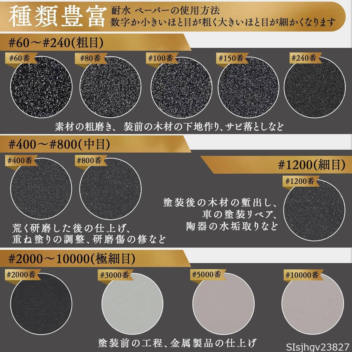 【種類が豊富】サイズ:75mmX75mm、粗目から細目まで、120枚に12タイプ(#60#80#100#150#240#400#800#1200#2000#3000#5000#10000各10枚)乾湿両用で使用可能。各サンドペーパーの裏には番号が付いています、小分け袋に入れてお届けしますので、紙ヤスリの番手を間違えることにご心配しないでください。