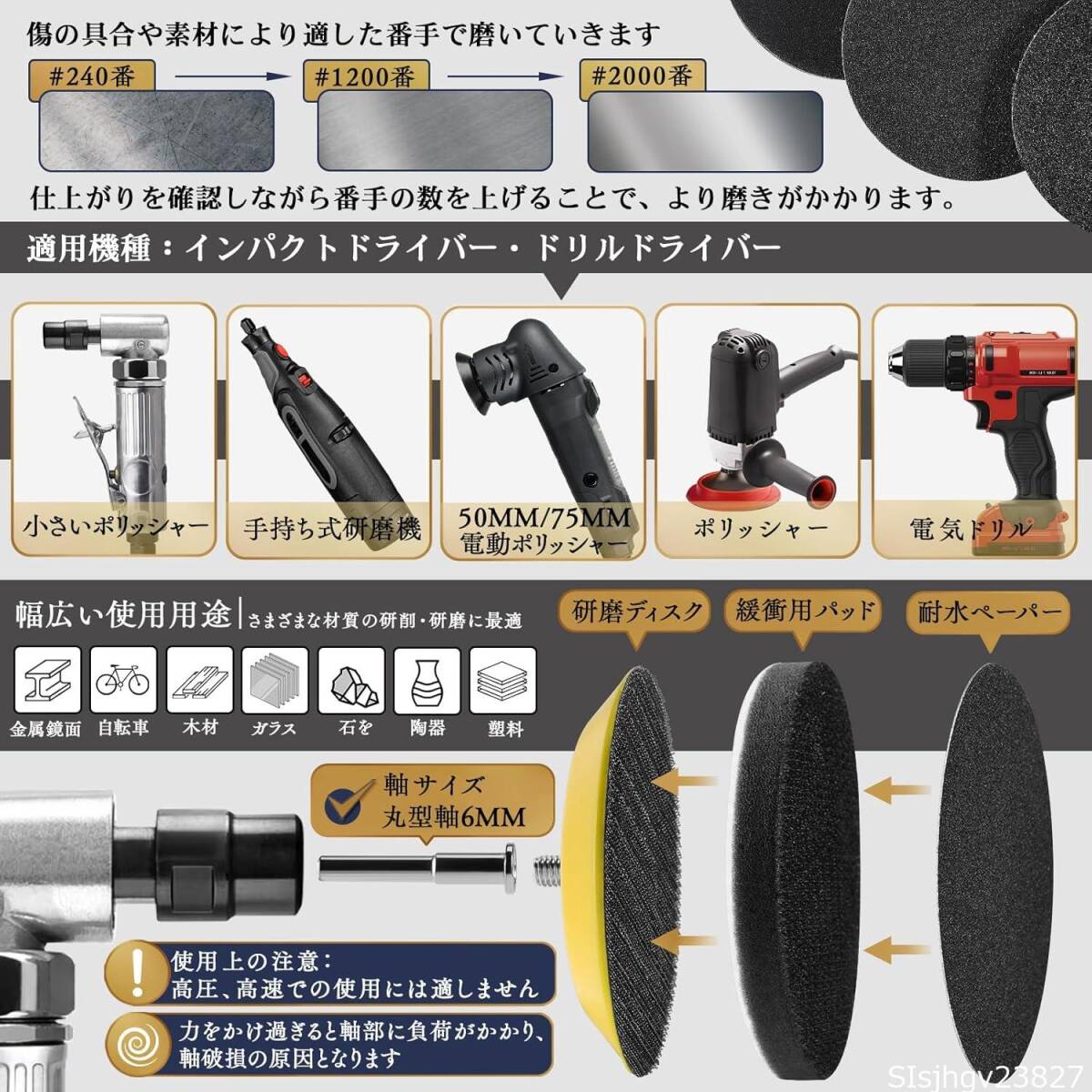 【取付が簡単】耐水 サンドペーパー 75mm マジック式で取り付けが簡単ですが、バフの背面は高品質なフランネル材質を採用して粘着力が強いで。研磨の対象によってポリッシャーバフか精練パットをお使いいただけます。アップグレードされたフック&ループ式バックパッドは、数秒で簡単に取り付けができ、湿式研磨でも強力に接着します。