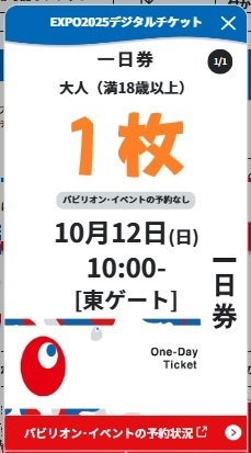 大阪・関西万博 EXPO2025 入場チケット 大人 10月12日 10時入場 予約済 10/12 | |