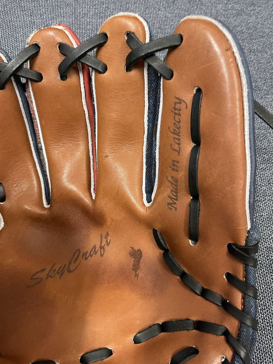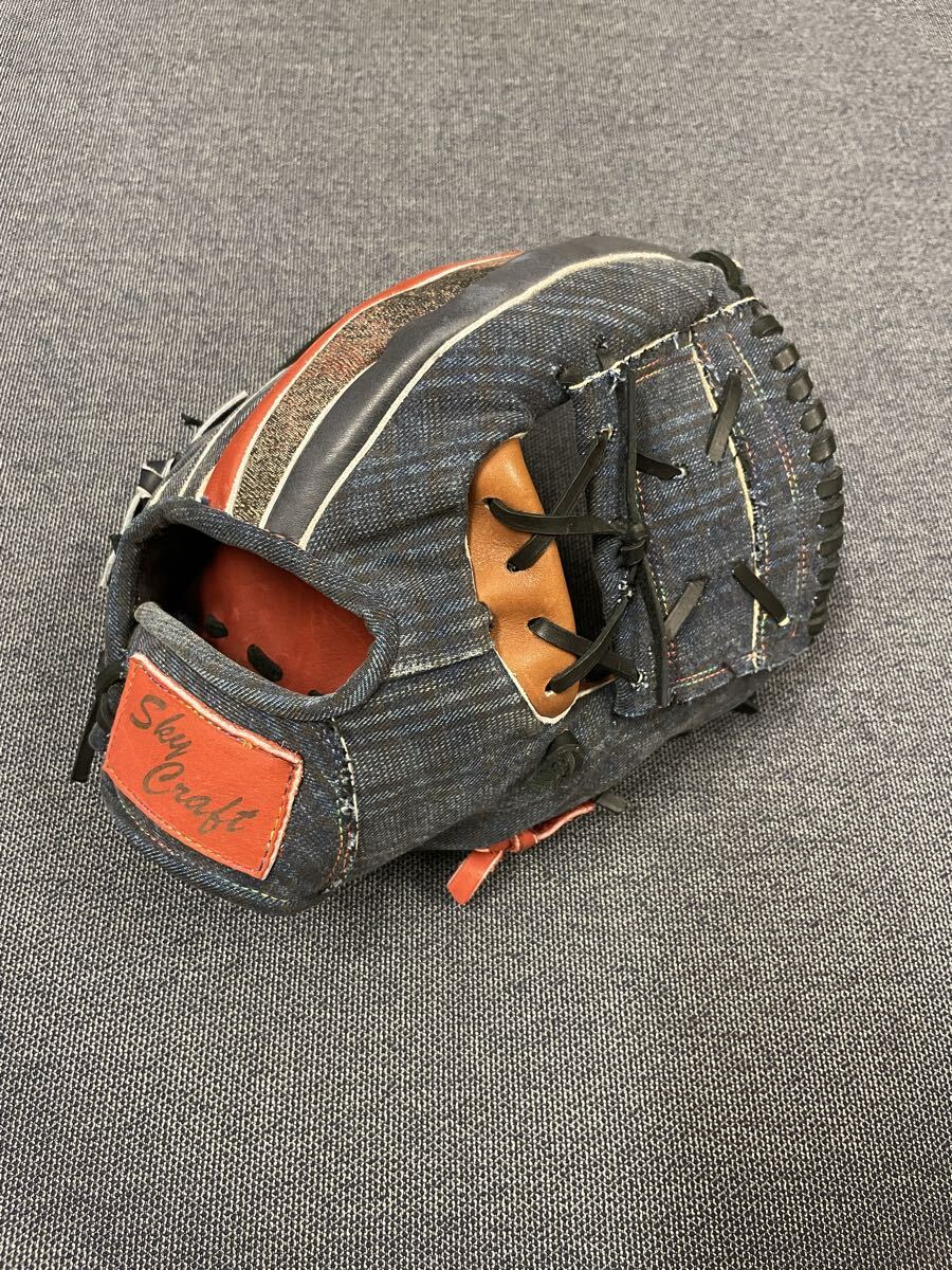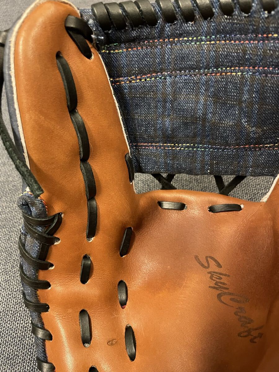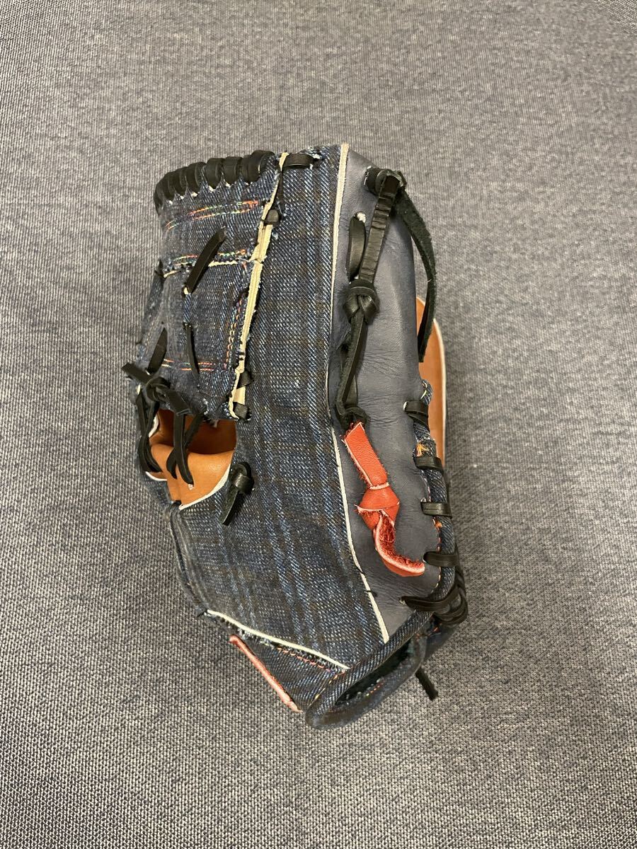 グラブ全体はレザーでできていて、デニム生地の部分生地の内側はレザーであり、レザー部分をデニム生地でコーティングされているようです。