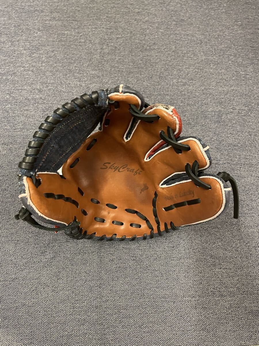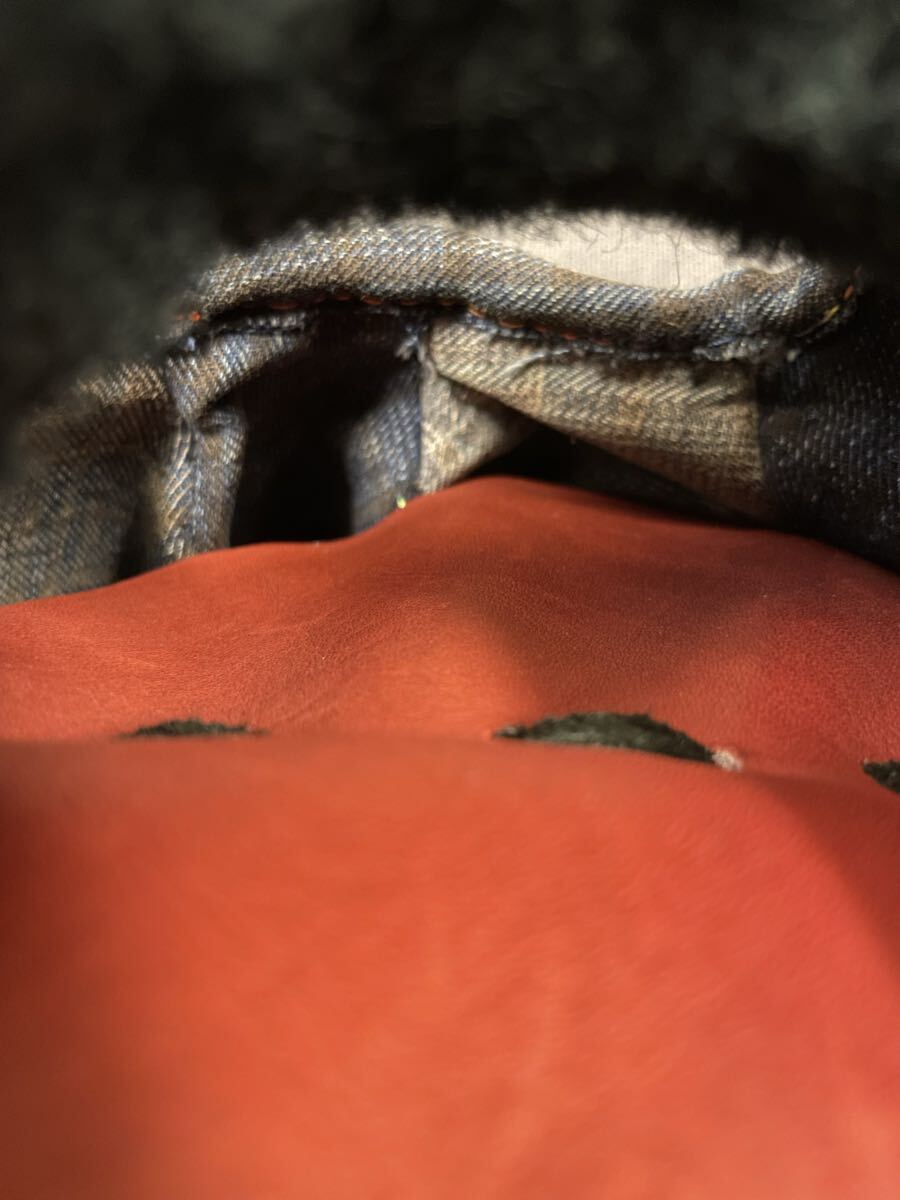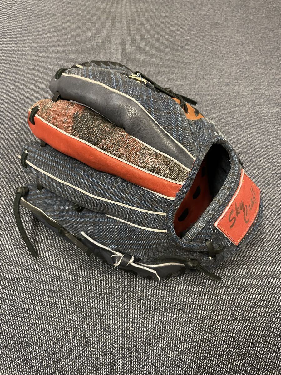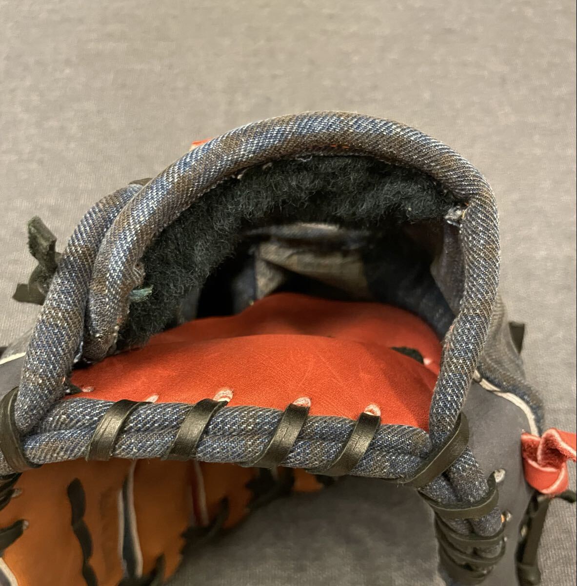 グラブ全体はレザーでできていて、デニム生地の部分生地の内側はレザーであり、レザー部分をデニム生地でコーティングされているようです。
