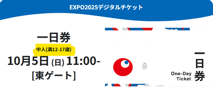 EXPO 2025 大阪・関西万博 一日券【中人(満12-17歳)】 10月5日(日)11:00- 東ゲート 10/5 ※小人(満4-11歳)でも利用可