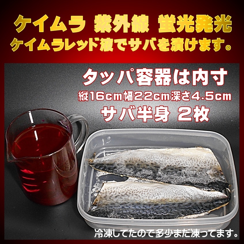 集魚剤 つけエサ用 紫外線 ケイムラ 蛍光 発光 加工液は、オキアミ イカ サバ サンマ イワシ ホタルイカ カツオ きびなご イソメ アサリのむき身などの つけエサに浸すことにより 紫外線加工 ケイムラ加工でき、水中で つけエサを 紫外線発光させるための液体です。