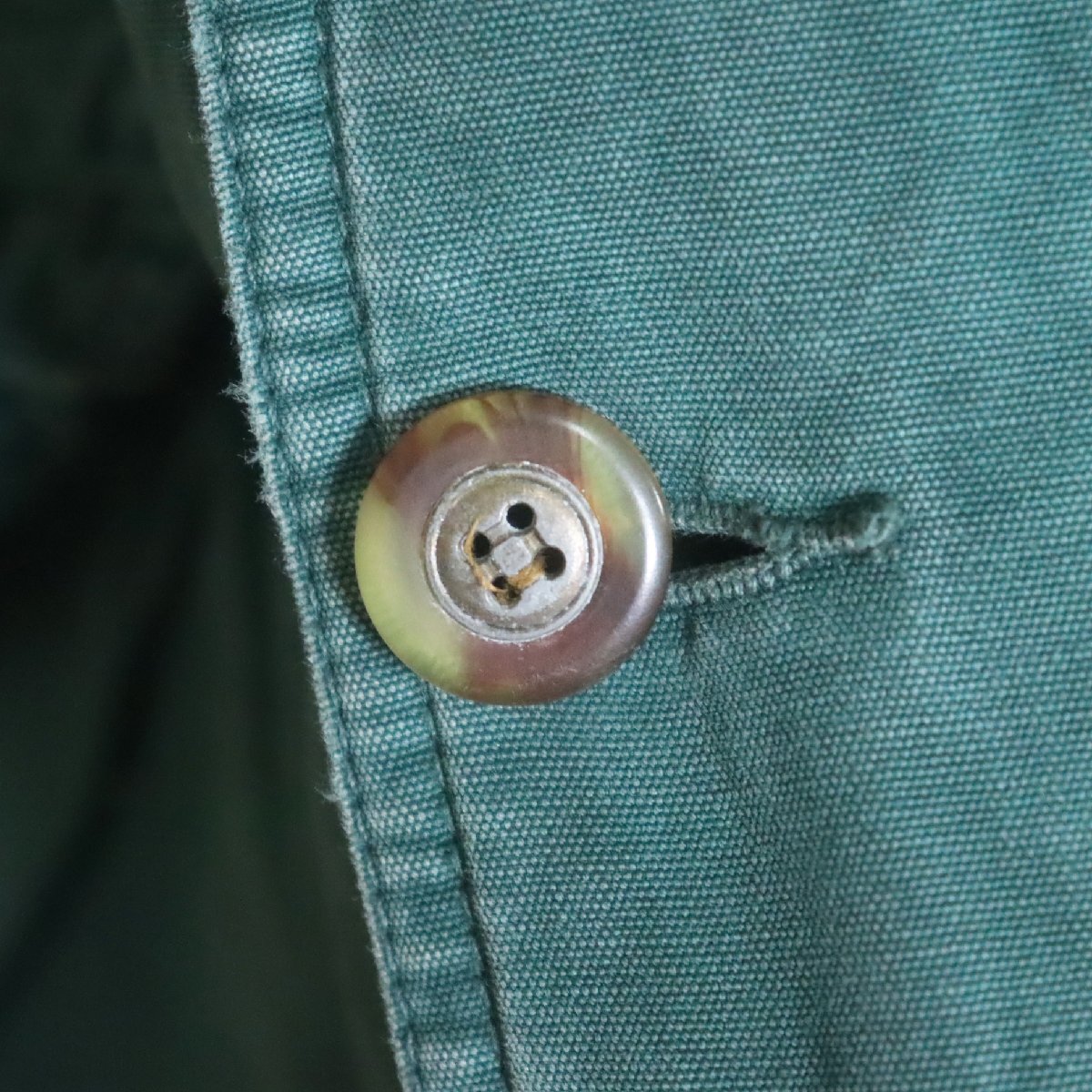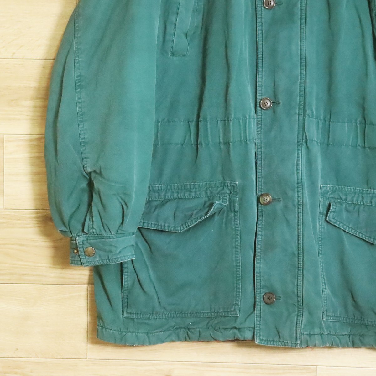 中古品です。使用感があります。ボディの所々と襟に薄汚れ、袖先と裏地に擦り切れ、第1,4ボタンに付け替えがありますが、他に大きなダメージはありません。付属のフードはありません。