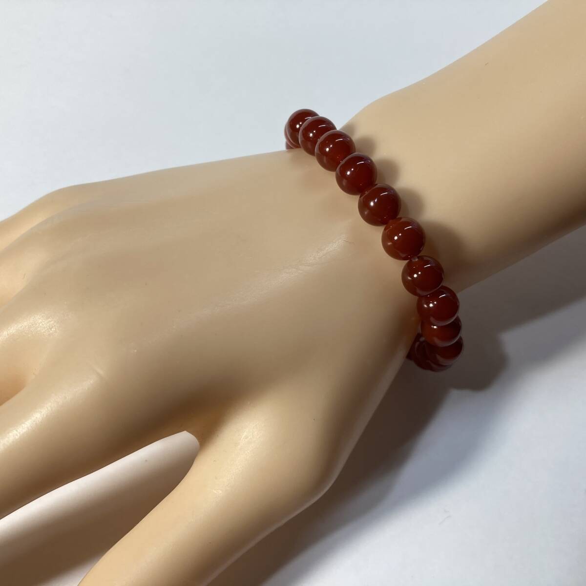 こちらは、赤瑪瑙の8mm玉を使用したパワーストーンブレスレットです。シンプルなデザインは、シーン問わずどんなコーディネートとも合わせ易いブレスレットです。サイズは内径約15cmです。気になる方はお早めにどうぞ。