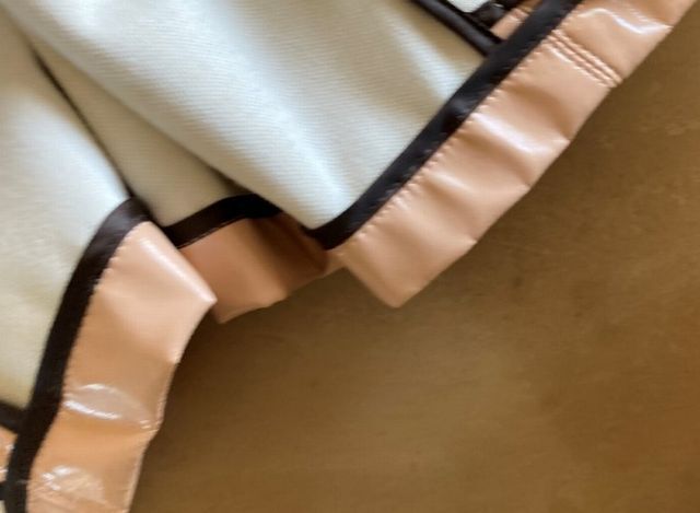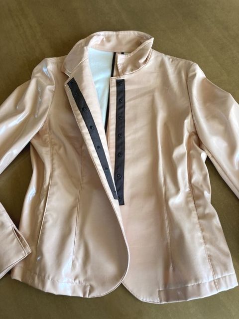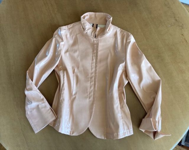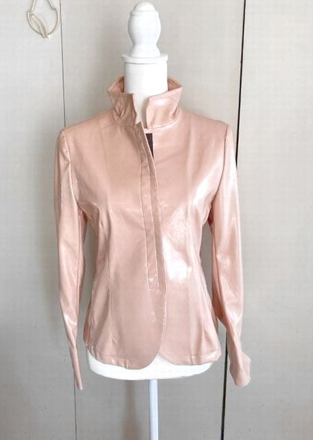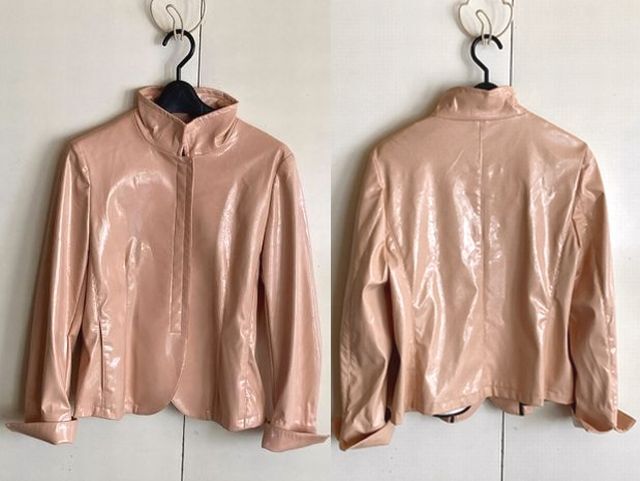 AGATHAのサーモンピンクの生地にポリウレタンコーティングを施して、エナメル風に仕上げたジャケットです。