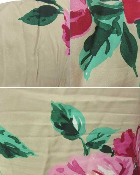 | ベージュ地に大き目お花デザインの華やかなブラウス。柔らかいシルク生地になります。鮮やかなお色使いで、お顔周りが華やかになります。きれい目スタイルにもカジュアルスタイルにもあわせて頂けます。 |
