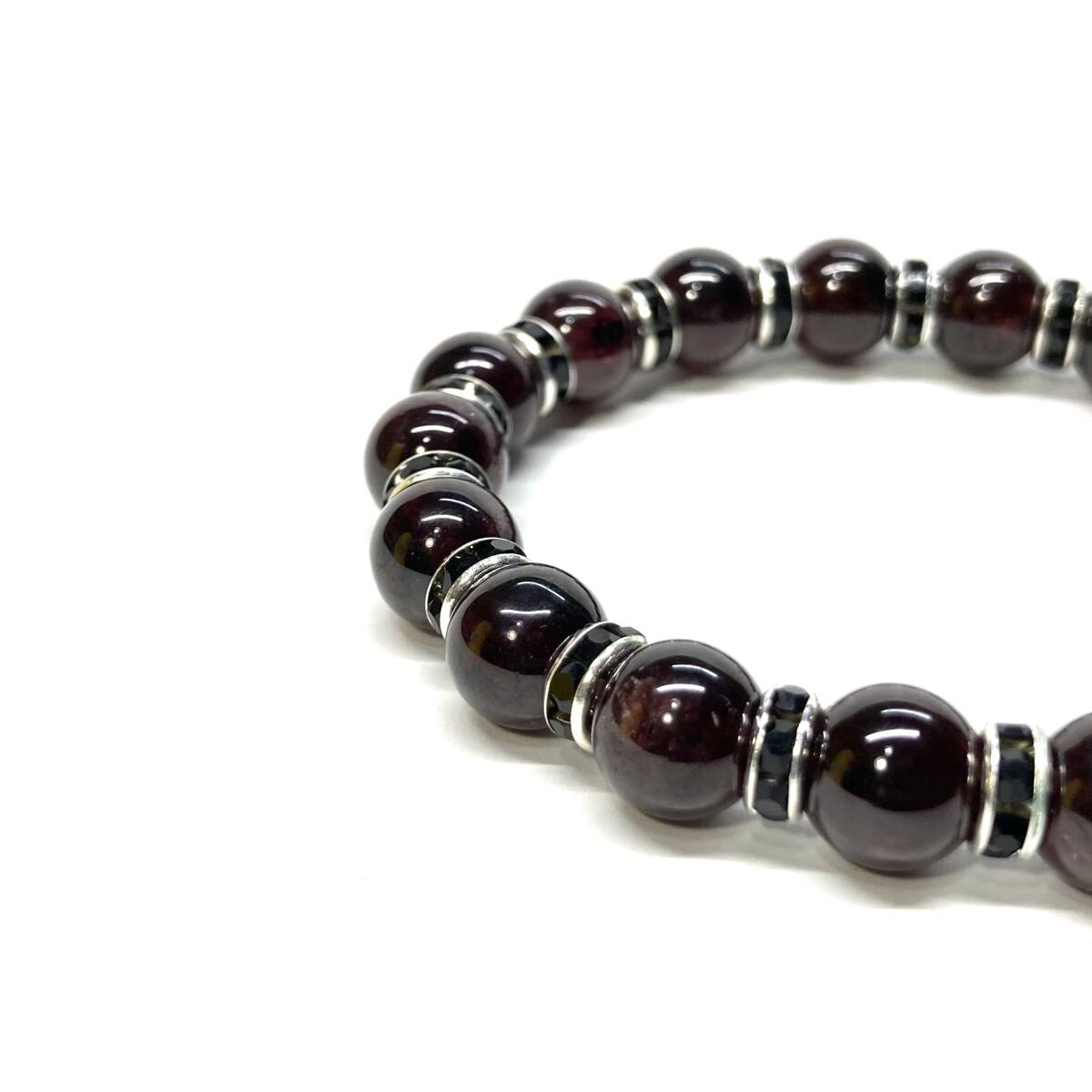 こちらは、ガーネットの8mm玉を使用したパワーストーンブレスレットです。石との間にはロンデルを挟み高級感を演出しております。シンプルなデザインは、シーン問わずどんなコーディネートとも合わせ易いブレスレットです。サイズは内径約15cmです。当社の中でも一番人気の実績があるデザインとなっております。気になる方はお早めにどうぞ。