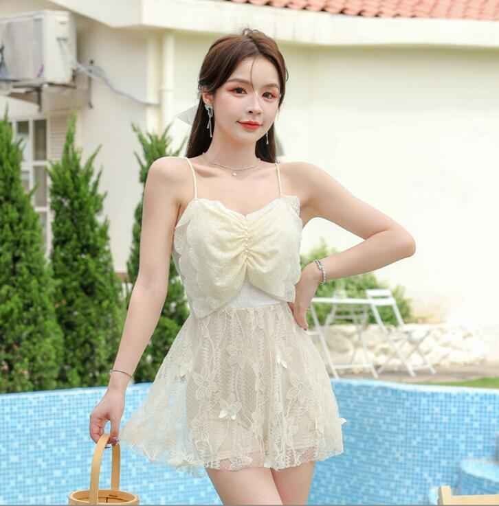 レディース 体型カバー 水着 オールインワン ワンピース水着 スカート水着 フリル スイムウェア XL オフホワイト