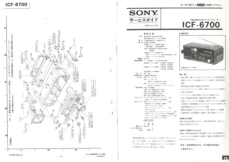 ■【商品名】・・・ソニーSS用★非売品★ICF-6700メンテナンスCDのPDF版。 ■ICF-6700のオーナーの方にお勧めです。 ■このCDを参考に往年の名機を蘇らせてください! ■1980年代に修理・調整用としてソニーのサービスステーションに配布されたそうです。 ■【コメント】・・・当初は、DocuWorksのファイルでしたが使用しやすいPDFに変換されています。 ■ICF-6700カラーサービスガイド完全版が収録されています! ■回路図&プリント基板図(★カラー)・分解・調整方法等が記載。(★画像2~4参照) ■PDFにパスワードの設定あり! ■PC閲覧は可能です! ■プリンターでの印刷はできません! ■キズ、擦れ、汚れ等が少しあります! ■外観は、画像を参考に判断して下さい! ■アルコールティッシュで清掃済! ■喫煙なし・ペット飼育歴なし! ■この機会にぜひ貴方のBCLコレクションに加えて下さい! | |
