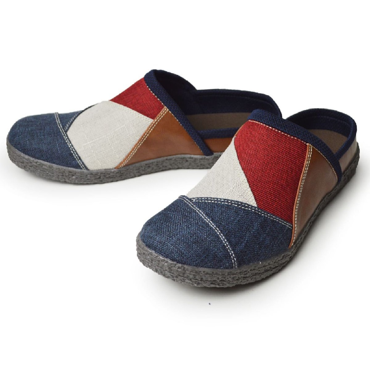 麻のような布生地は温かみのある印象を受け、折り重なったアッパー部分は色鮮やかなパッチワークが目を引く上品な仕上がりに。