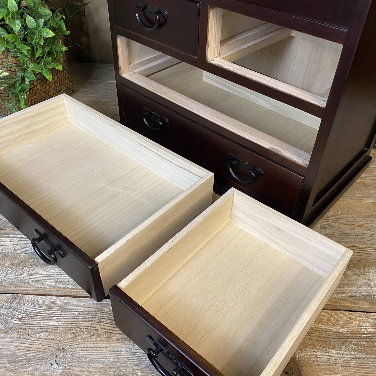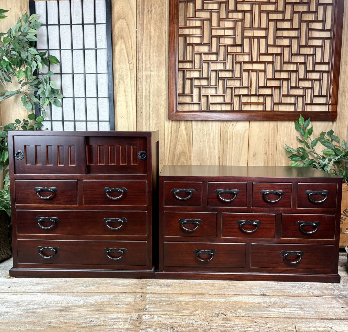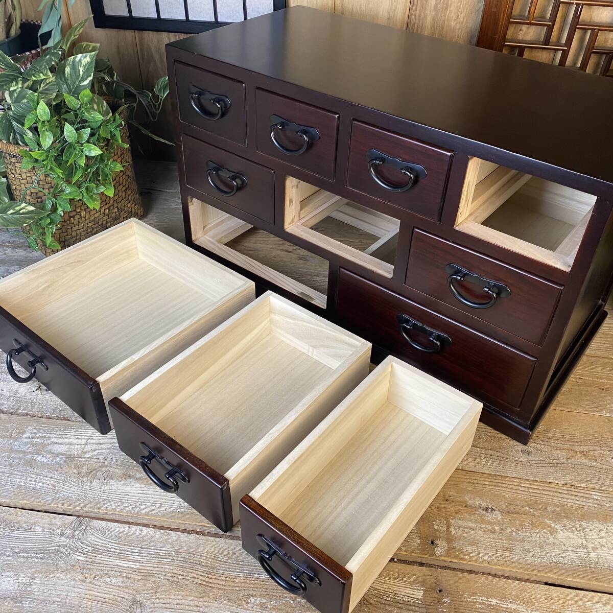 ◆◇商品詳細◇◆ 民芸家具多引き出しタンス 民芸調和多引き出しタンスチェスト二点セットです。古き良き和の心、深みのあるお色が素敵な品です!お部屋のインテリアやショップのディスプレイ、和室にも合わせやすいですよ!小ぶりなタンスですが、引き出しが多く、小物をたくさん収納できます。アパート小部屋、施設ルーム、寮部屋などに最適なサイズ感です。和室や、アジアンテイストインテリアに良く合うお品です。天板が広く、飾り台やテレビ台などにもアレンジできそうですね! 【商品状態説明】 小キズあり、まずまずの美品。 完成品になります。 ※こちらの商品は、新品未使用品ですが、現品画像ではありません。製造段階や輸入段階での小キズ等で検品落ちしたB級アウトレット品の中から順番に発送しております。ほとんど気にならない程度の小キズになり、使用には全く問題はございません。 【サイズ】 引き戸付タイプ 横幅:56cm(下部土台含む横幅:58㎝) 奥行:34cm 高さ:58cm 引出し内寸小22.5㎝×29㎝×8㎝ 引出し内寸大49㎝×29㎝×8㎝ 引き戸内内寸52㎝×29㎝×14㎝ 横長タイプ 横幅:70cm(下部土台含む横幅:72㎝) 奥行:34cm 高さ:41cm 引出し内寸小12.5㎝×29㎝×8㎝ 引出し内寸中18㎝×29㎝×8㎝ 引出し内寸大29㎝×29㎝×8㎝ 木製桐材無垢 【カラー】 ブラウン | ◆◇発送方法◇◆ ●送料は基本無料ですが、沖縄・離島などにお住まいの方はご負担ください。 (沖縄・離島の方はメールにてご連絡いただければ、送料をお知らせいたします。) ●ヤマト運輸・佐川急便・第一貨物のいずれかにて配送いたします。 (運送会社の指定はできません。ご了承ください。) ●日時・時間指定のある方や、お問い合わせ(追跡)番号をご希望の方は取引連絡の際にお知らせください。 | |