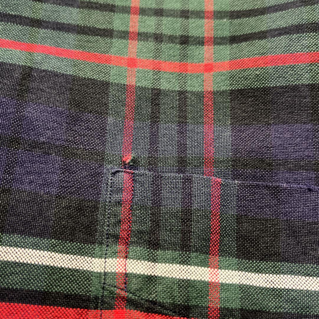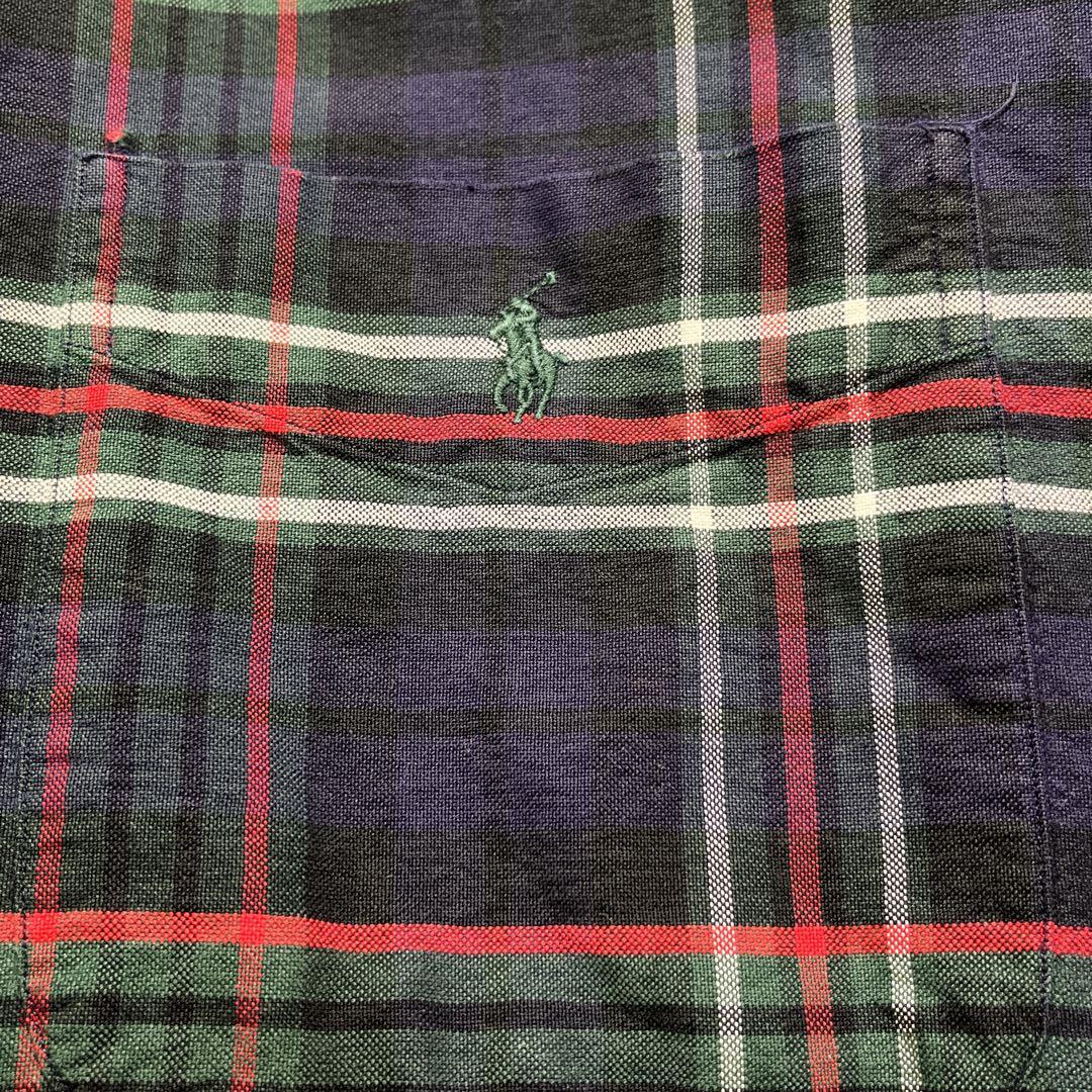 ネイビーベースにレッドとグリーンのクラシックなチェック柄、胸元にはポニー刺繍入り。
