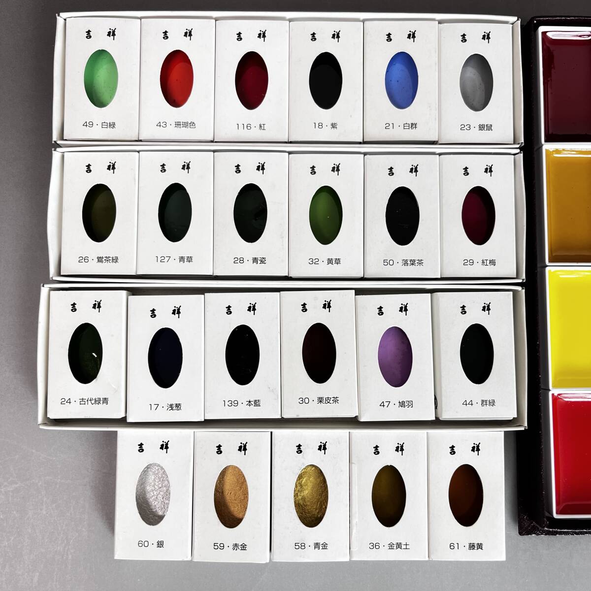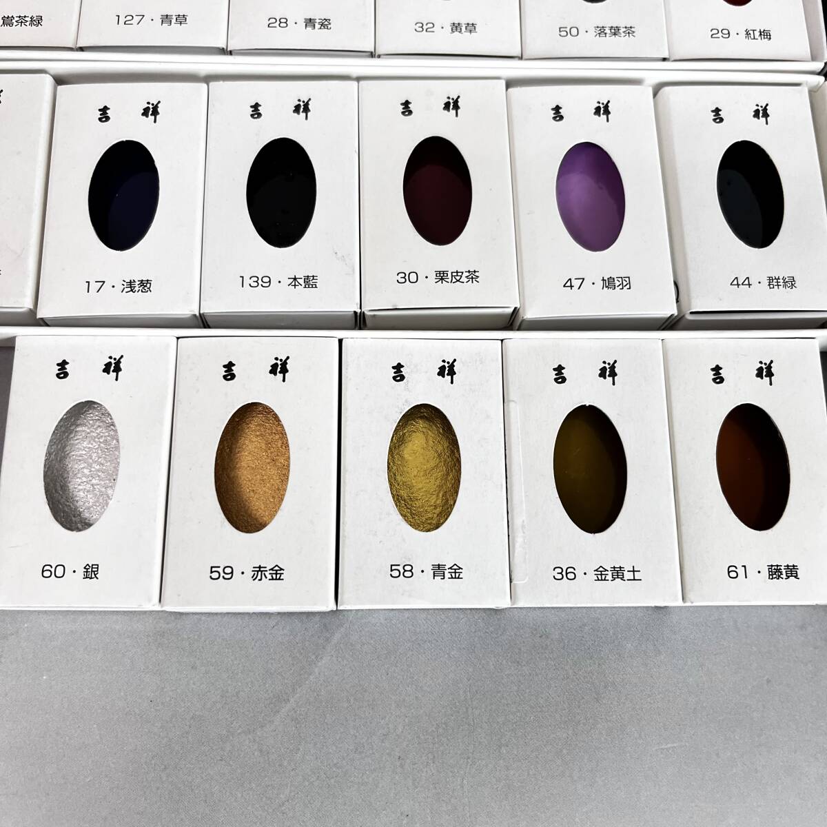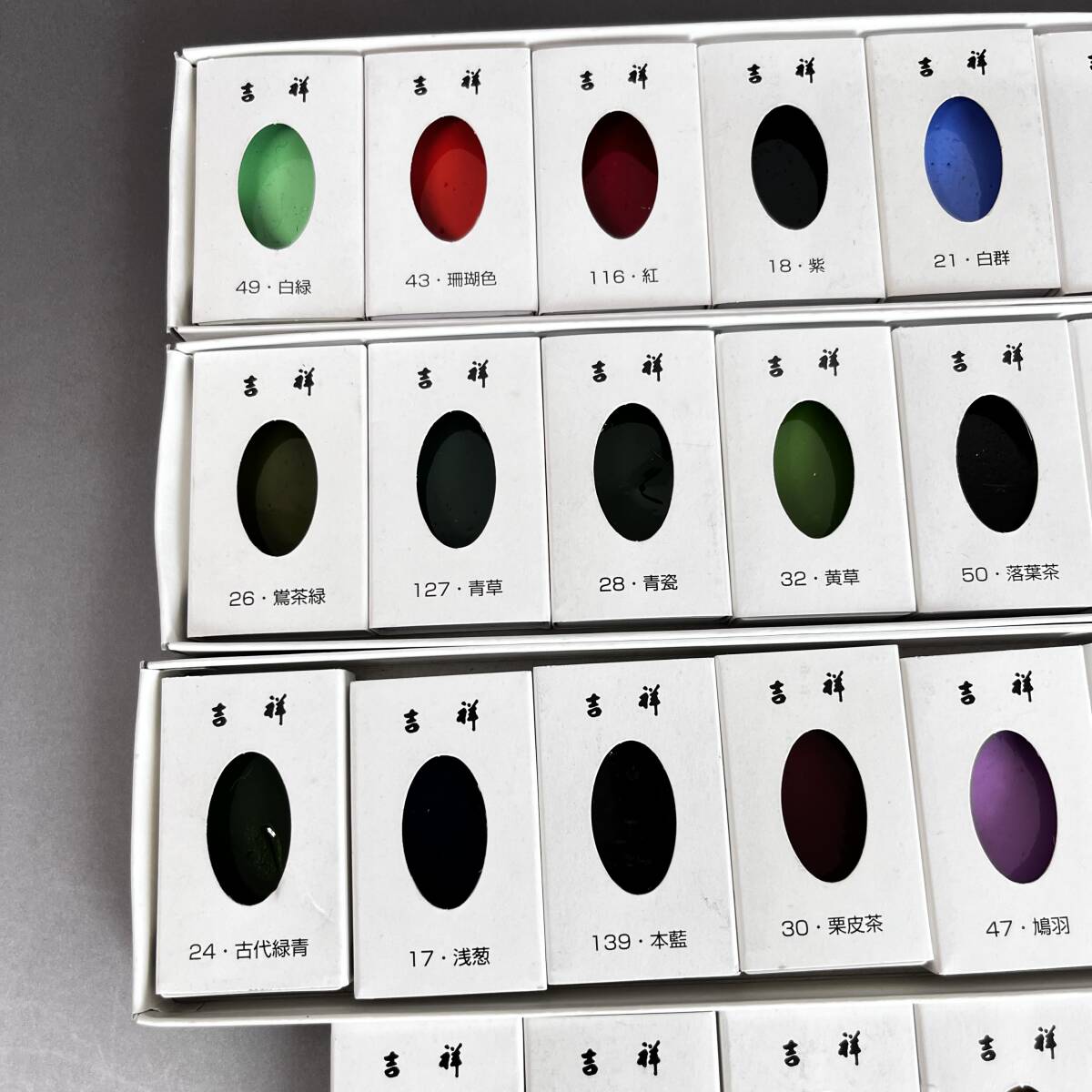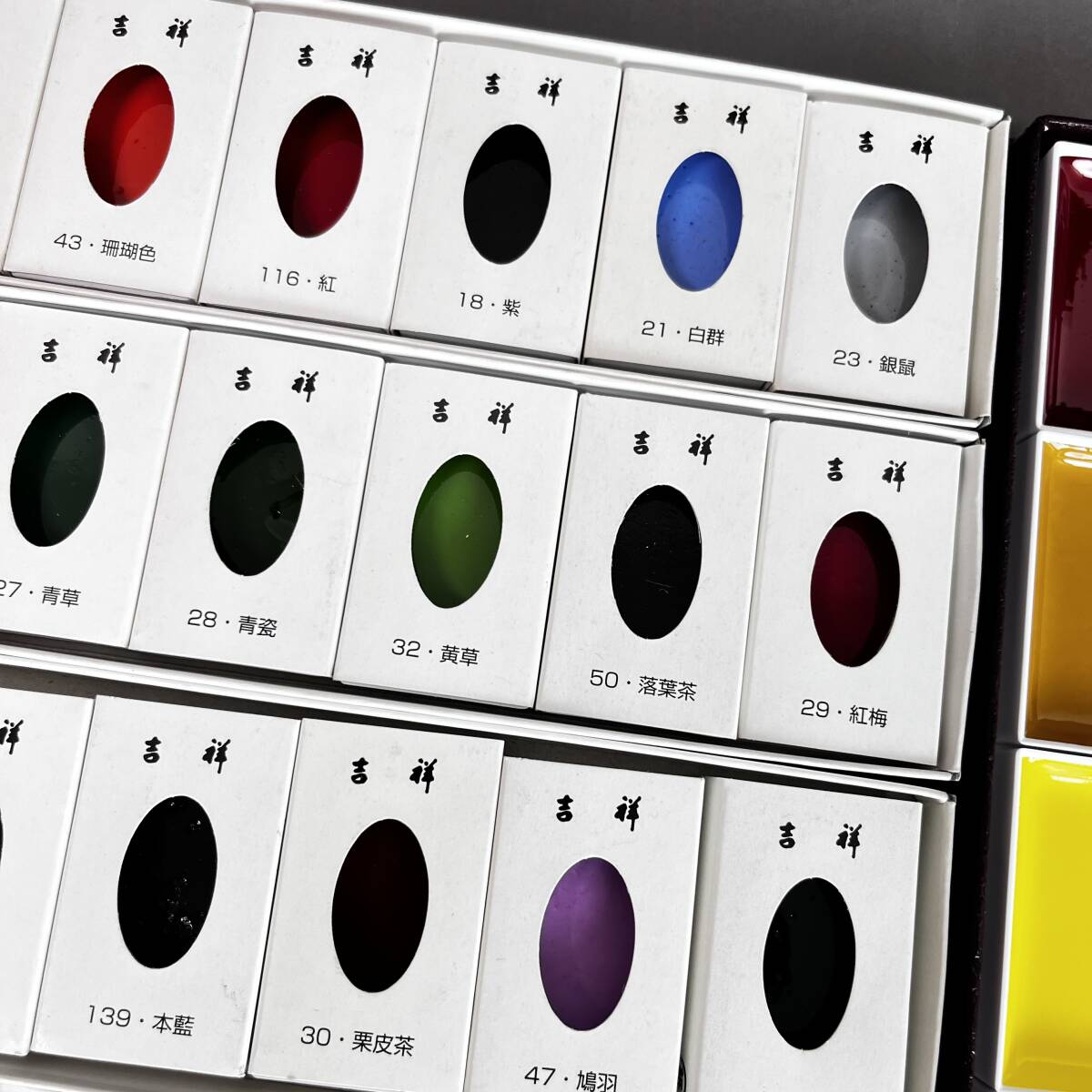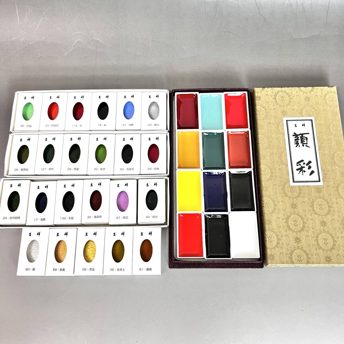 水干絵具やチューブ絵具と同じ顔料に、天然高級デンプン質と膠分を加え、練り混ぜたものを顔彩と呼びます。