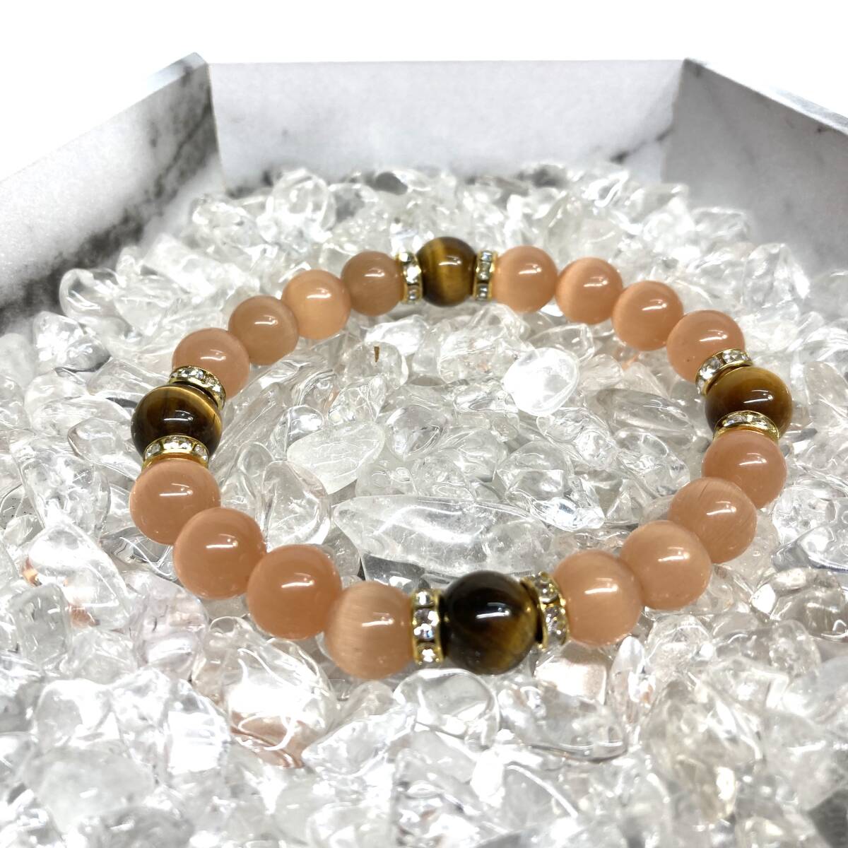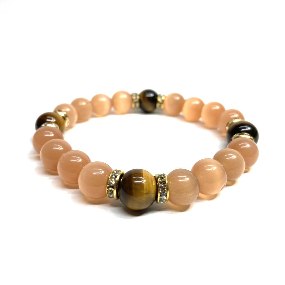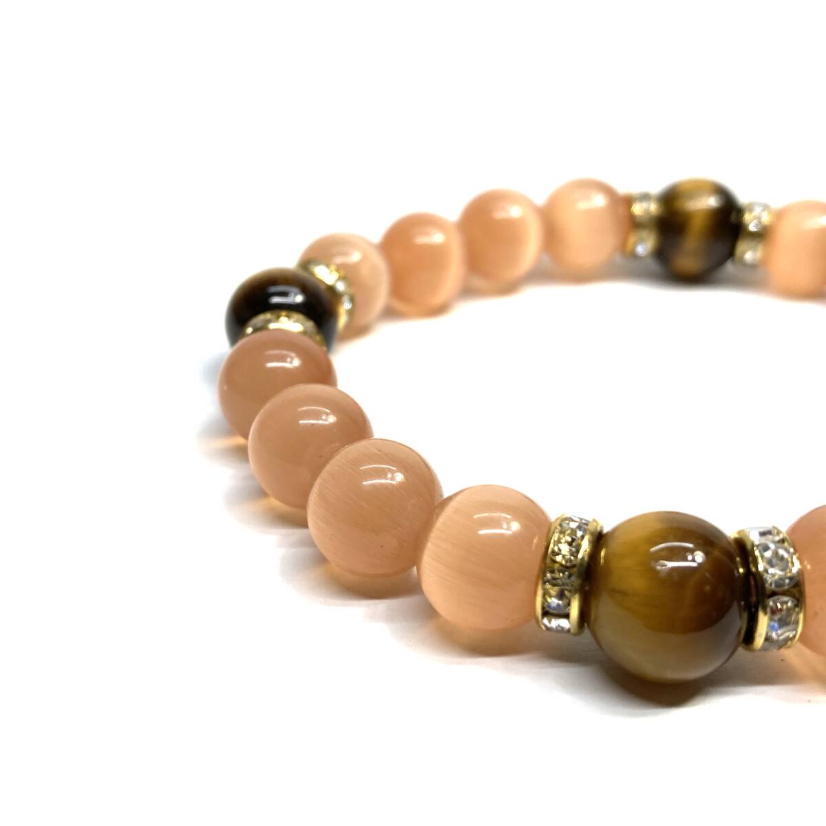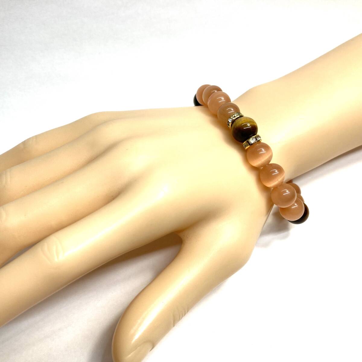 こちらは、キャッツアイとタイガーアイを組み合わせたブレスレットです。間にはロンデルを挟み高級感あるデザインに仕上がっています。石大きさは腕にも馴染みやすいように10mm玉で内周約17cmです。数に限りがございますので気になる方はお早めにどうぞ。