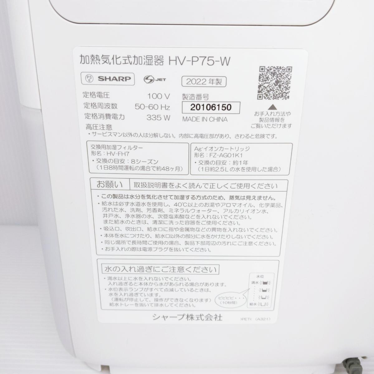 SHARP シャープ プラズマクラスター加湿気化式加湿器 2022年製 HV-P75〇YR-54020〇【中古品】