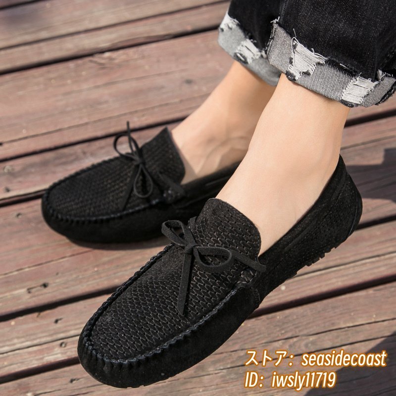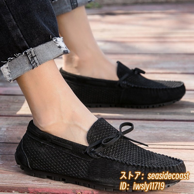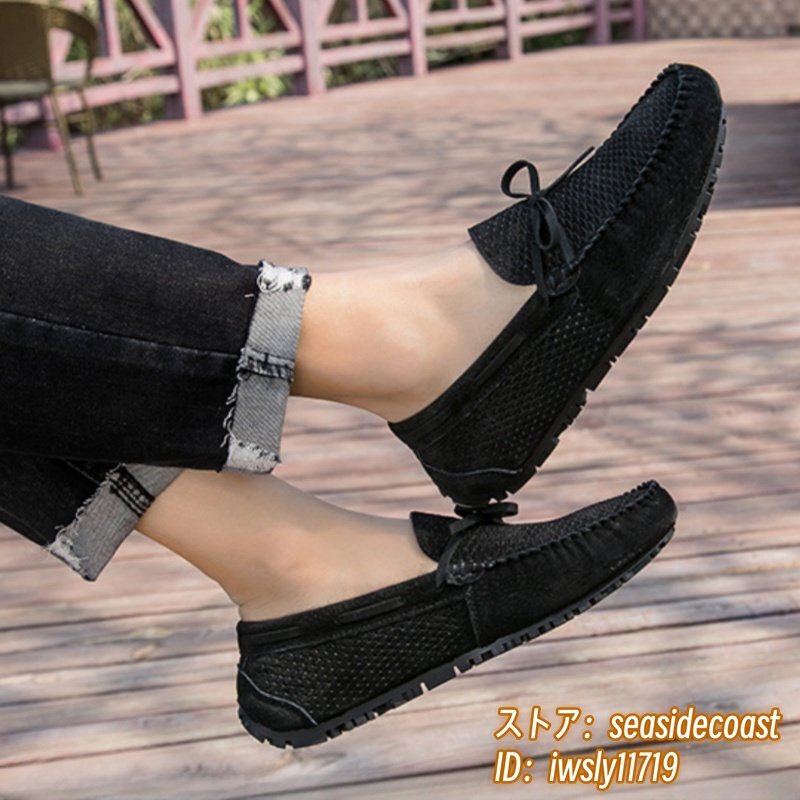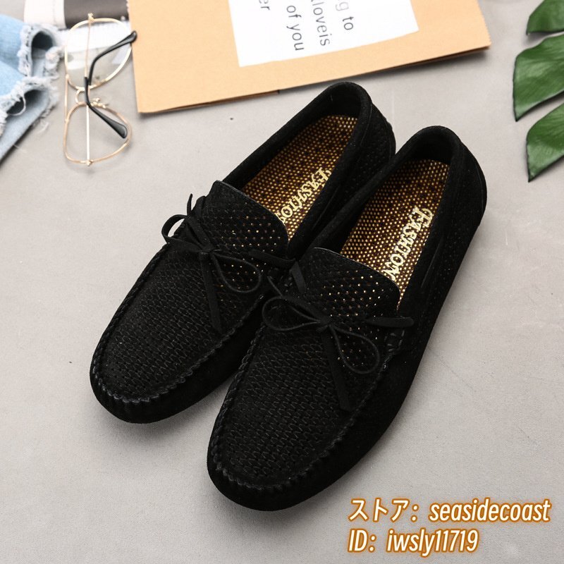 夏新品 ローファー スリッポン 本革 ドライビングシューズ 牛革 メンズ レザーシューズ スエード革 透かし彫り メッシュ ブラック 26.5cm