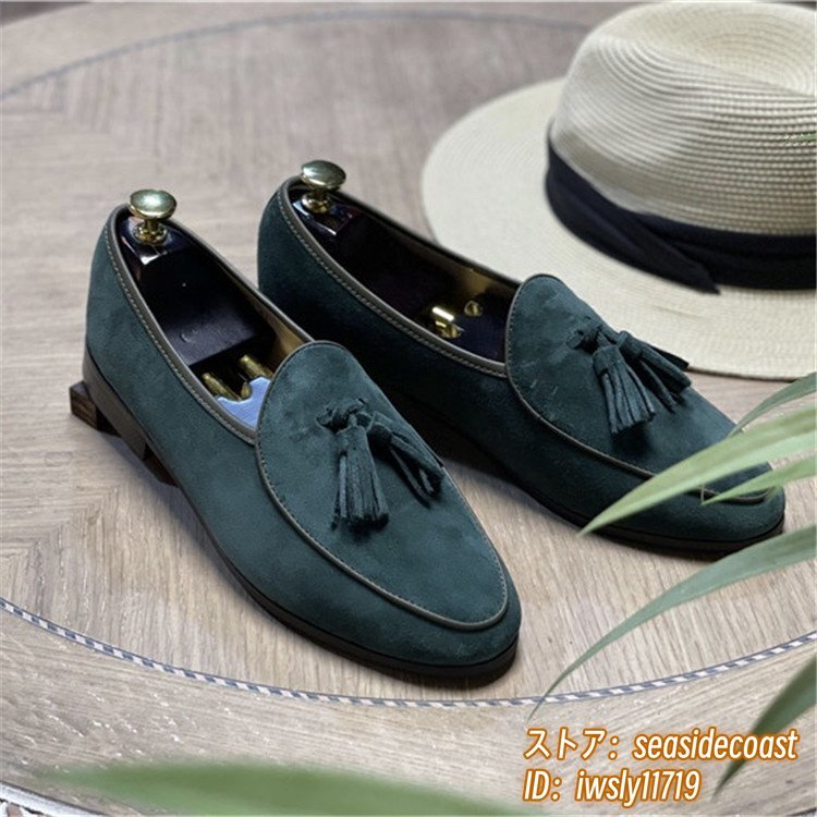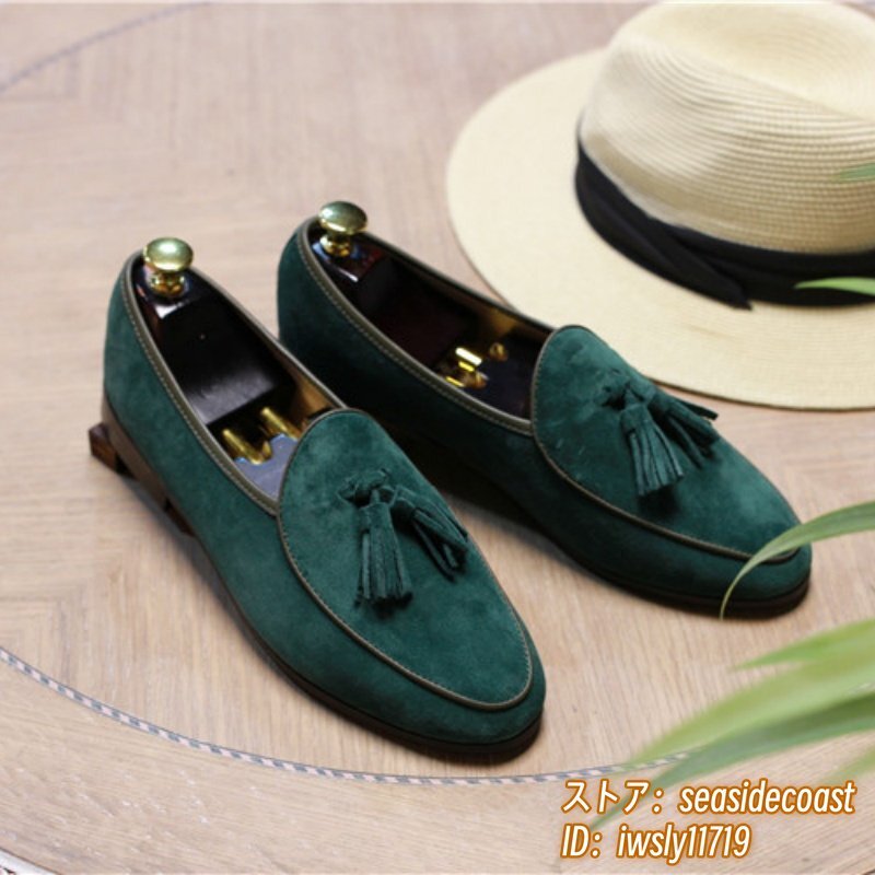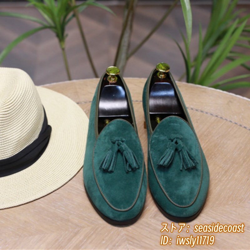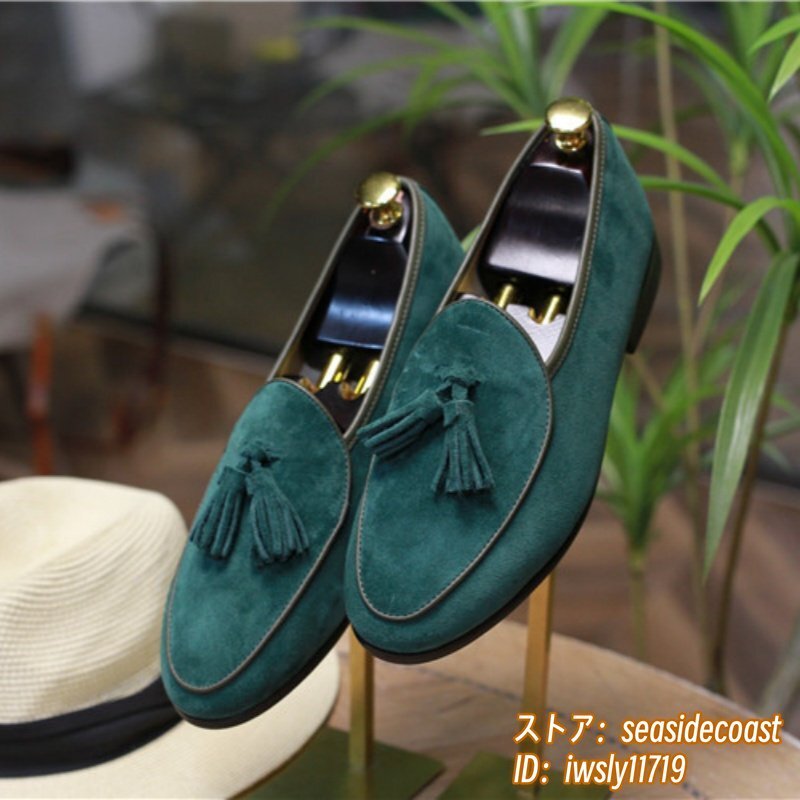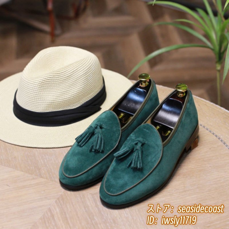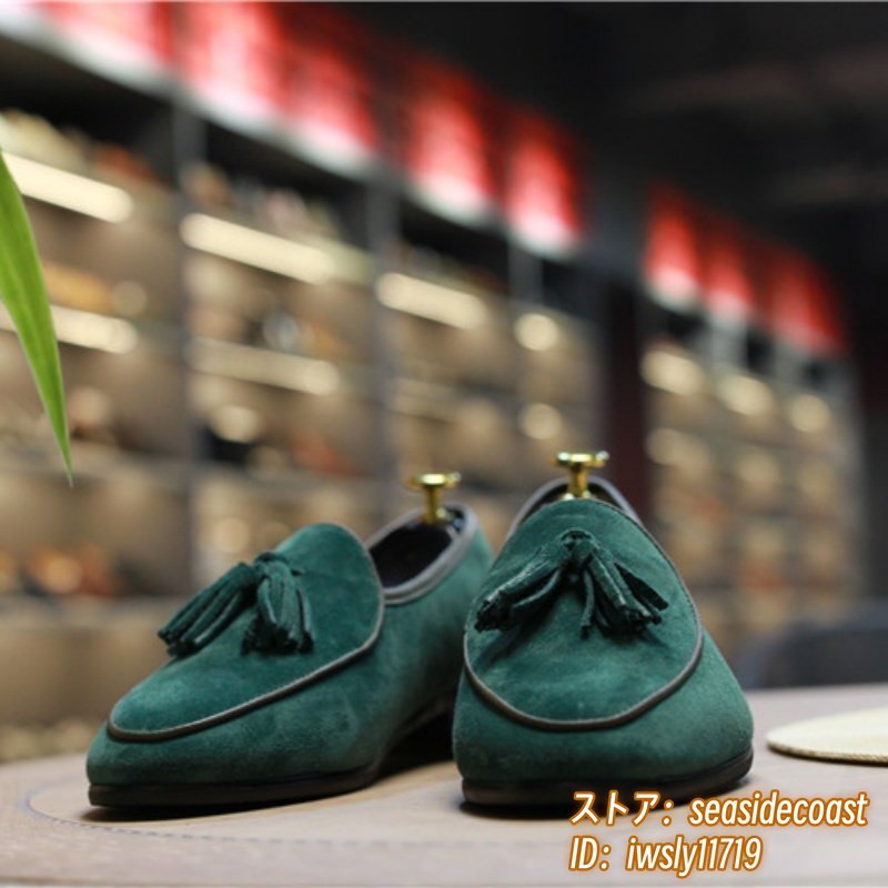 定価9万超★最高級 ビジネスシューズ 本革 レザーシューズ 職人手作り フリンジ 紳士靴 スエード 牛革 ドレス 結婚式 革靴 グリーン 26.0cm