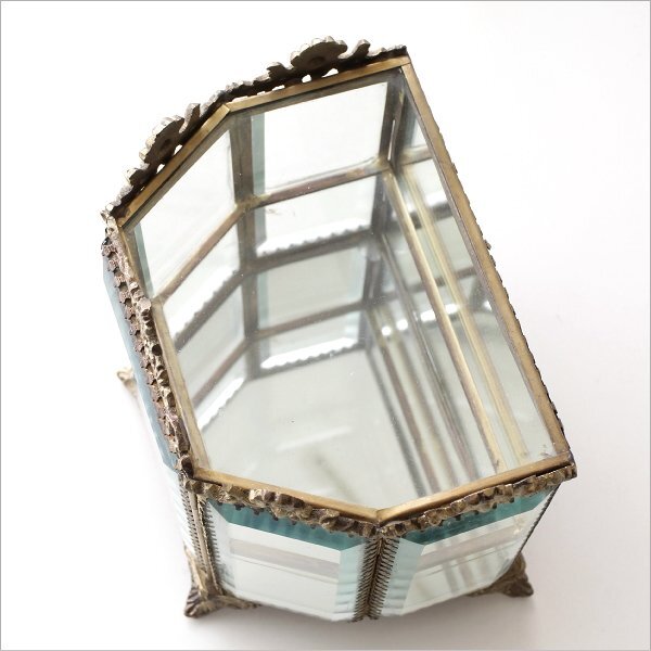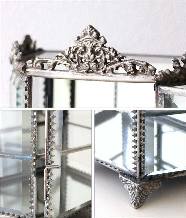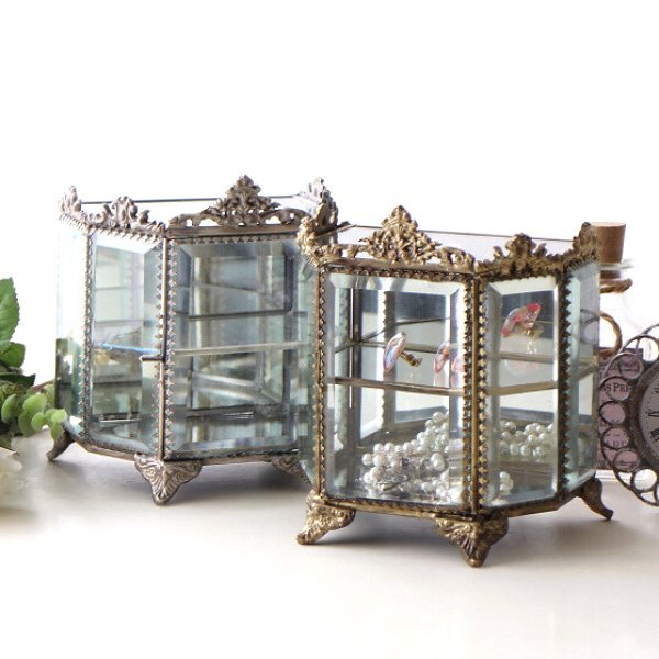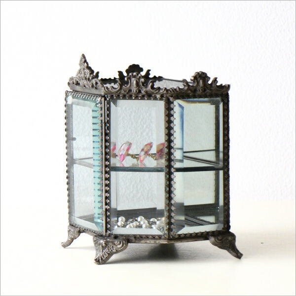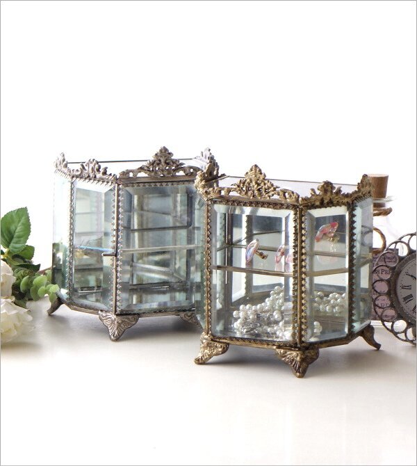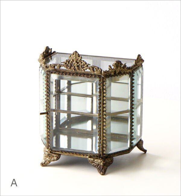 | こちらのページでは【Aカラー】のみの販売です レトロ調の真鍮とカットガラスの 小さなケースは 固定棚が1枚付いていて アクセサリーや小物などを 美しく仕舞って置ける 上品なディスプレイケース レトロな真鍮と多面ガラスの風合いは こだわりの空間に優しく溶け込む クラシカルでお洒落な存在になりそうです 商品名 : レトロな真鍮とガラスのコレクションケース 商品番号 : vin3847 全体のサイズ(cm) : 幅14.5×奥行12×高さ17 ボックス内のサイズ : 共通)幅13×奥行9.5×高さ5.5 材質 : 真鍮 ガラス 重量 : 1.15kg 生産国 : インド ※商品の特性上、手作り商品のため、わずかなガタつきや傾き、ガラスの小傷、汚れ等はご容赦ください ※真鍮の特徴である、空気中の成分と反応して起こる色のムラ・黒ずみ(経年変化)が見られます。素材の特性と風合いをお楽しみください [ ガラスケース 真鍮 アンティーク コレクションケース 扉付き 小物収納ケース ミラー 2段 棚 脚付き アクセサリーケース クラシック ヨーロピアン かわいい おしゃれ ディスプレイケース ゴールド シルバー ] |