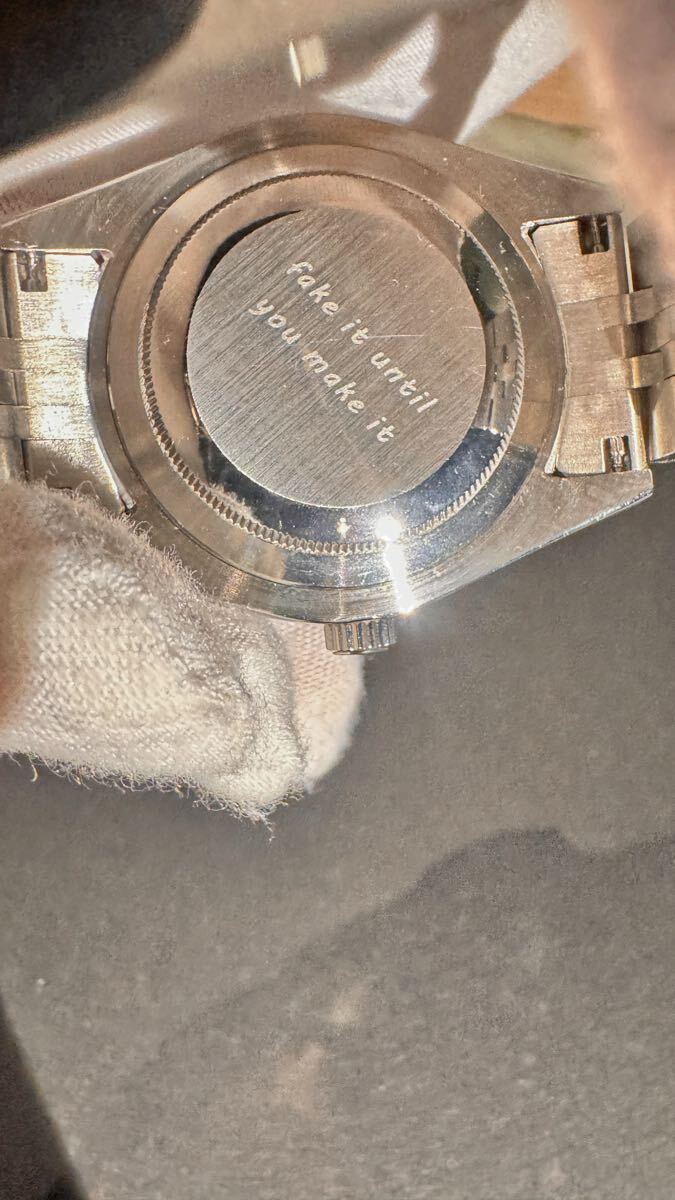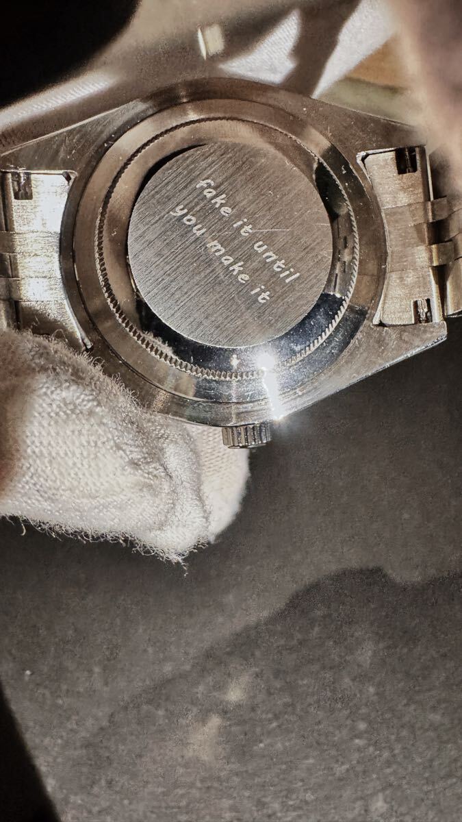 ウォッチの裏側にも驚きが隠されており、「fake it until you make it」と刻まれています。シリコンバレーに伝わるこの力強い言葉は、まるで各々の着用者を激励しているかのようで、たとえ今完全に理想の状態に達していなくても、信念を持って努力し、成功するまでがんばるべきだと伝えています。