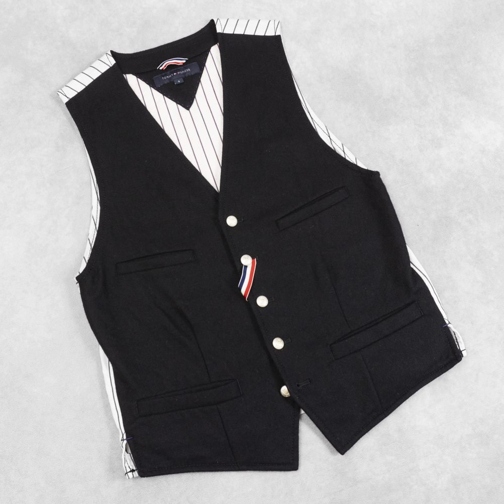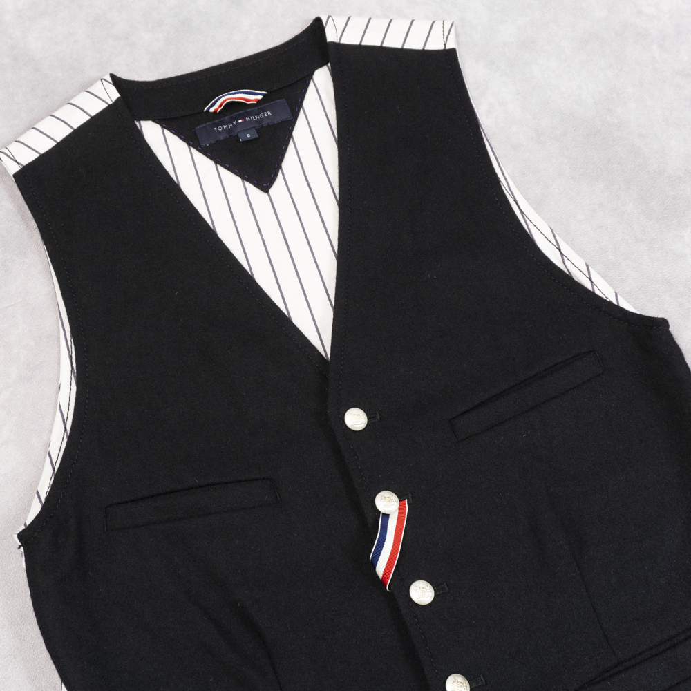 上質な1着『TOMMY HILFIGER』ウールジレ Sサイズ ブラック ベスト メタル釦 日本製 トミーヒルフィガー メンズ 管理11154