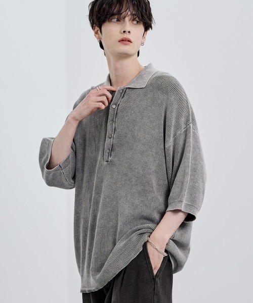 参考商品名:ピグメント加工片畦半袖襟付きヘンリーネックニット