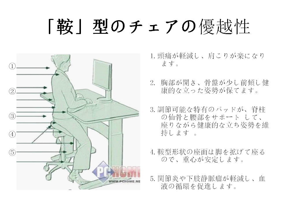 | 商品説明 | ![]() 【送料無料!】新品 「鞍」型 オフィス パソコンチェア ☆腰痛改善 リクライニングチェア 腰にぴったりフィットタイプ♪ ☆毎日のデスクワークを健康的な直立姿勢でお過ごしください! 【送料無料!】新品 ロデオ「鞍」型 オフィス パソコンチェア ☆長時間馬に乗っている処からヒントを得て開発されたロデオ「鞍」型のチェアです ☆特殊なデザインで、肩から脊柱や腰部までサポートし、健康的な立ち姿勢を維持します ☆カラーはホワイト・ブラックの2種類でご注文後ご希望のカラーをお申し付け下さい ☆「鞍」型のチェアの優越性といたしましては下記内容が立証されていります 1.頭痛が軽減し、肩こりが楽になります 2. 胸部が開き、骨盤が少し前傾し健康的な立った姿勢が保てます 3.調節可能な特有のパッドが、脊柱の仙骨と腰部をサポートし、座りながら健康的な立ち姿勢を維持します 4.鞍型形状の座面は脚を拡げて座るので、重心が安定します 5.関節炎や下肢動脈瘤が軽減し、血液の循環を促進します ☆「鞍」型のチェアの構造 1.背もたれ部分にスウィングゴムを使用し、素材は防水性に優れ、グリップ力のあるインテグラルスキンウレタンです 2. 鞍型形状の座面は脚を拡げて座るので、重心が安定し作業の合間にストレッチができます、テーブルに合わせて最適な座高さに調整ることが出来ます 3.ガスシリンダー昇降式足置き付 4.移動しやすい用にキャスターが付いています 5.座った状態で背中を支えながらリクライニングの角度を調整できます 6.高さを調整できます 7.背もたれの高さを調整できます ☆「鞍」型のチェアの仕様(商品画像参照) ①. W:58CM (キャスター部分) ②. D:58CM (キャスター部分) ③. 地面より82~92cmに高さが調整できます(背もたれ部分) ④. 地面より42~52cmに高さが調整できます(座椅子部分) ⑤. 背もたれ上下10㎝幅まで収縮調整できます(背もたれ) ⑥. 8.2KGS ☆ロデオ「鞍」型 オフィス パソコン 腰痛改善 リクライニング付き 腰にぴったりチェアを特売通販価格で是非この機会に! ![]() |