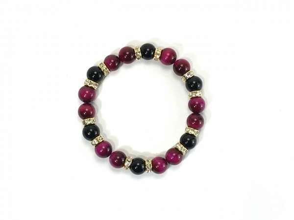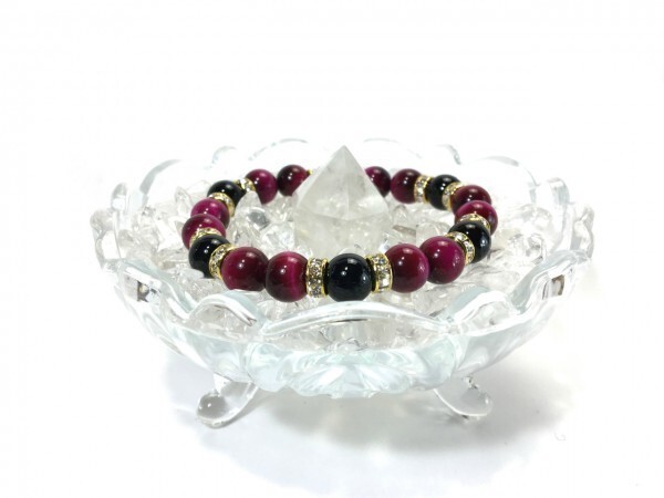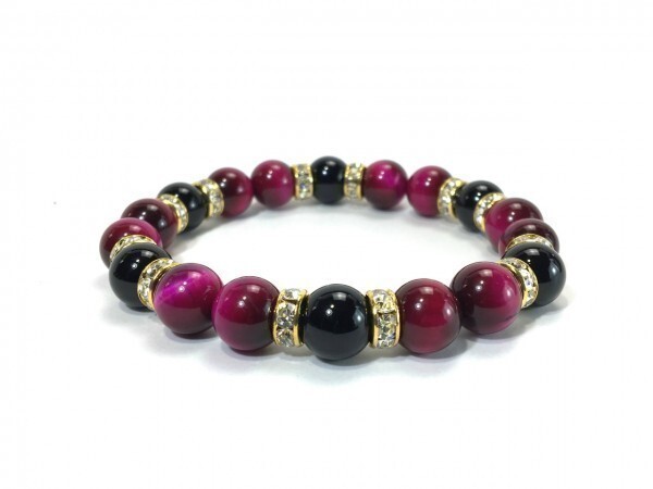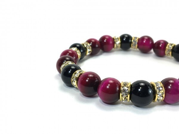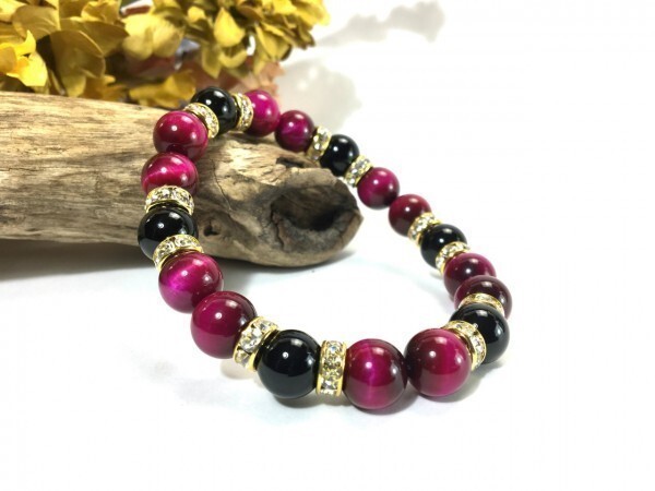 こちらは、ピンクタイガーアイとオニキスを組み合わせたブレスレットです。間にはロンデルを挟み高級感あるデザインに仕上がっています。石大きさは腕にも馴染みやすいように10mm玉で内径約18cm(伸可能)です。数に限りがございますので気になる方はお早めにどうぞ。サイズ調節も可能ですのでサイズ調節の場合は取引ナビにてご一報くださいませ。(サイズ調節無料です)
