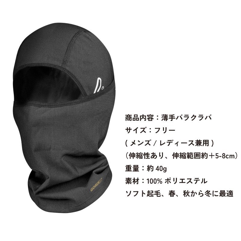 薄手の冬秋春向けバラクラバ。 生地厚すぎないので首がごわつく事もない。また長いシーズン着用いただけます。 顔を出して野外活動をする際、冷たい雨風から顔全体をガードするフルカバーマスク。 空気中の粉塵から顔全体を守り、耳までしっかりと保護。 内部はソフト起毛で暖かく肌触りは良く気持ちがいい着用感。 軽量で柔らかいので長時間でも疲れない。 伸縮性もあり締付け過ぎずフィット感も優れています。 速乾性があり水や汗で濡れても乾くのに時間をかけない。 UVカットUPF50+で自転車などの長時間外で活動する時の紫外線による日焼け対策に。 目元以外は覆われるので日焼け対策にとても有効です。 日差しから肌を守る。紫外線濾過率99%以上! 最高値のUPF50+で紫外線から肌を守り日焼けを防止します。 自転車やバイクのヘルメットやスキー、スノーボードのヘルメットやキャップのしたに着用する事もできます。 サイクリングやスノボー、バイク、釣り、キャンプなどの様々なスポーツでも大活躍。 寒さや、埃、紫外線などの対策に。 商品内容バラクラバ サイズフリー(メンズ/レディース兼用)(伸縮性あり、伸縮範囲約+5~8cm) 重量約40g 素材100%ポリエステル |