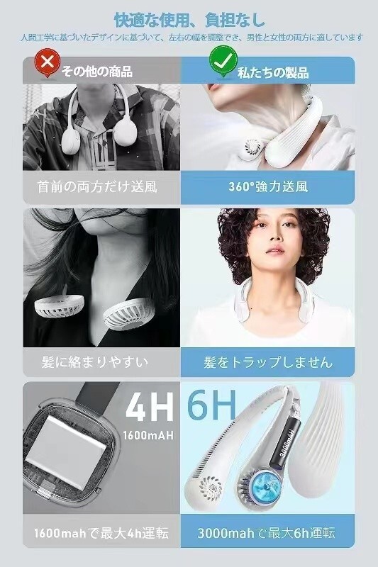 【安全なブレードレスネックファン】従来のネックファンに別れを告げる、ブレードレスデザインのこのパーソナルファンは、髪の毛が絡まる心配がありません。お子様やお年寄りにも安心してご使用いただけます。特にアウトドアスポーツや仕事に適しています。