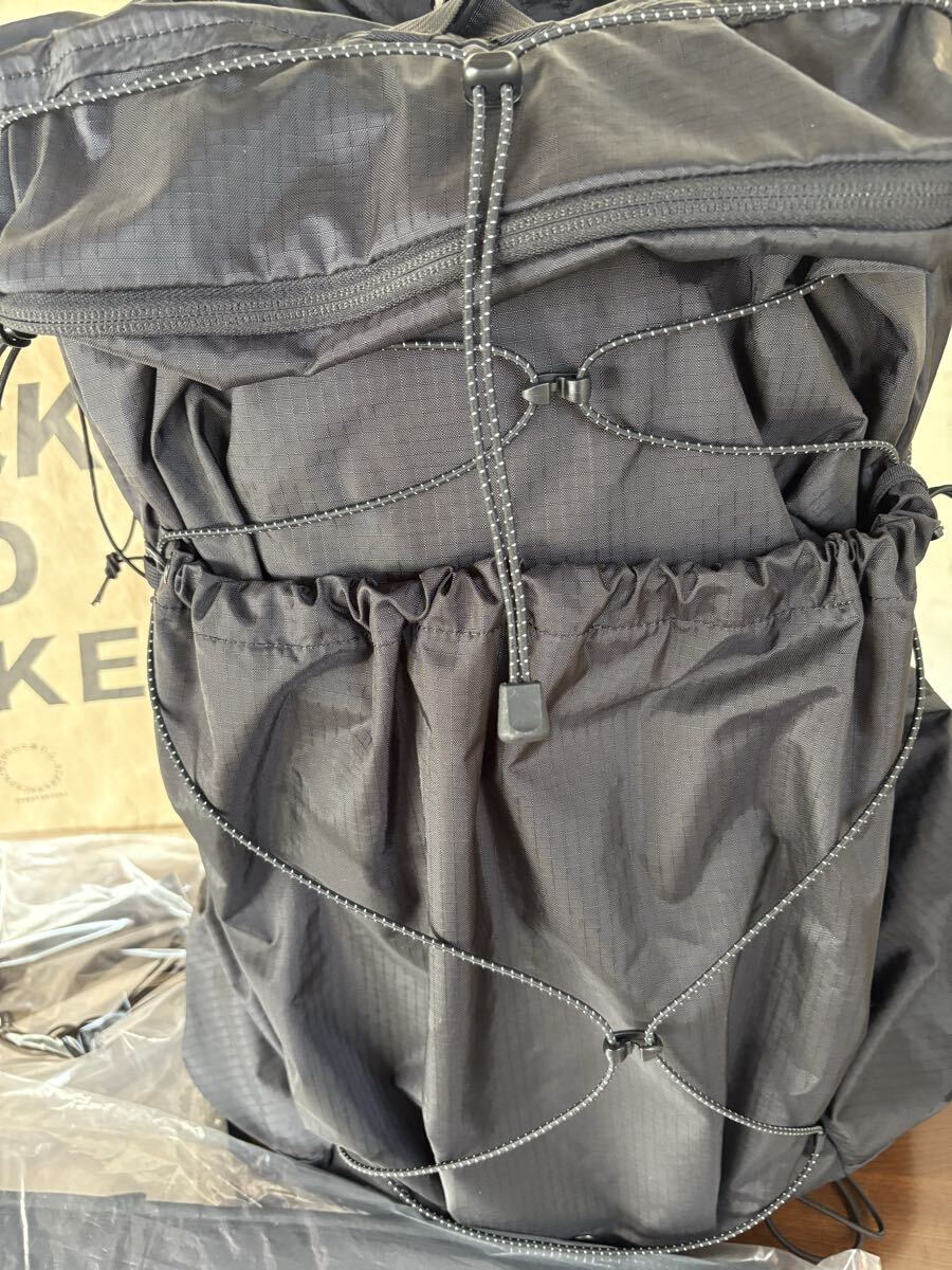 一度荷物を入れてみました。 汚れはほぼありません。 ダメージもありません。 サイドコンプレッションコードをバンジーコードに変えています。 サイズは背面長48cm、ウェストベルトXS(72〜79cm)、カラーはブラックです。
