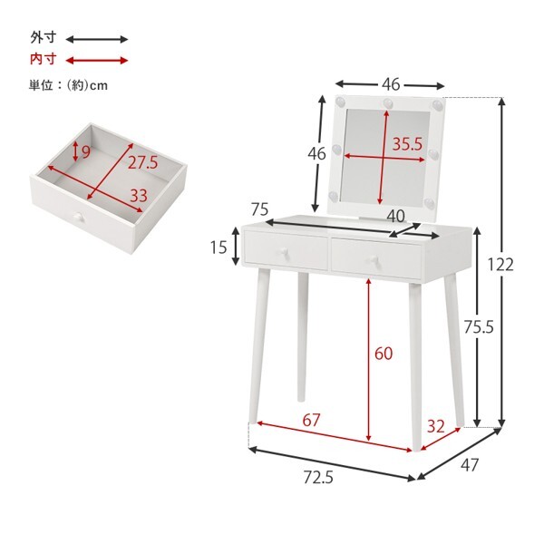※現在ご覧の商品ページは正方形/ホワイトのご購入ページとなります。 ヤフオクの仕様上単一ページに複数バリエーションを掲載することができませんので、他バリエーションが希望の場合は別ページでご購入お願い致します。 LEDの女優ライト付きのドレッサー。 使う人を選ばないシンプルなデザインで、ベロア調クッションのスツール付。 配達業者を指定いただくことはできません。 北海道/沖縄/離島のお届けに別途中継料金が発生します。 ※別途送料が発生する場合は後ほどご連絡させていただきます。 当店は正規店です。 タイミングによっては在庫切れの場合があります。