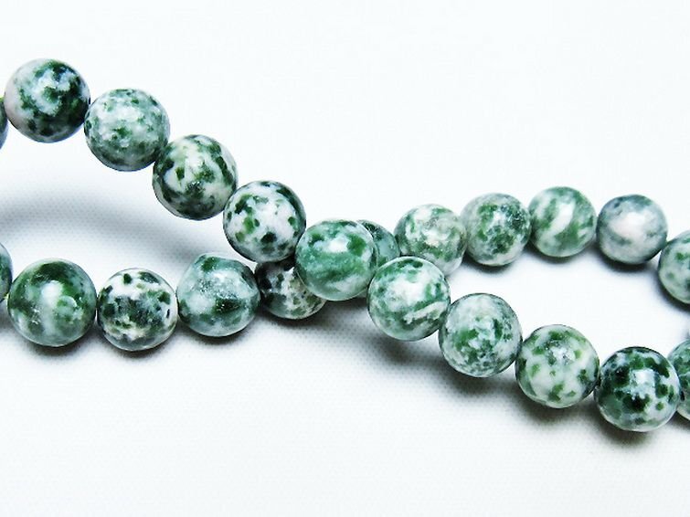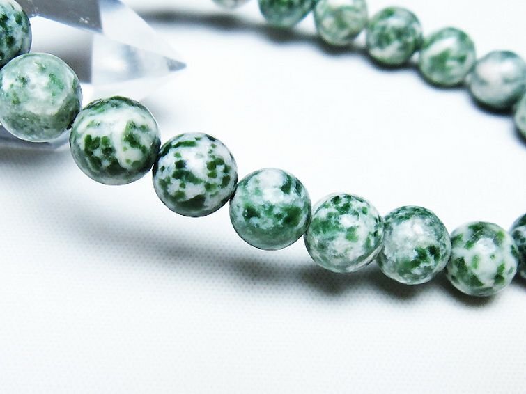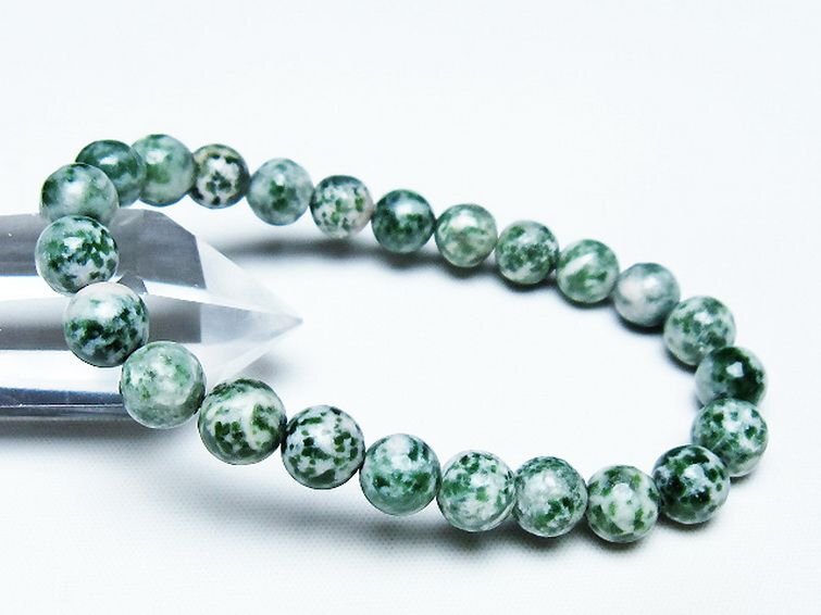 ■商品名: グリーンスポットジャスパー ブレスレット ■商品ID: T285-1306 ■商品重量:約 20g ■商品サイズ:内周約:160mm(±5mm)粒直径約:8mm(±0.5mm) 【ジャスパー(碧玉)】 ジャスパーは石英の結晶に様々な不純物が混じり結合した鉱物で、アゲートやカルセドニーと同じ仲間です。 構成が似ているため分類が難しいのですが、基本的に不純物の割合が多く不透明のものがジャスパーとされています。 抽象画のような味わい深い模様を持つものや鮮やかな色合いを持つものなど多彩な表情を持ち、個性を楽しめる石のひとつだといえるでしょう。 ジャスパーは日本にも縁が深く弥生時代から管玉や勾玉に加工され古くから装飾品として愛用されてきました。 なかでも島根県の玉造温泉は玉造石を使った勾玉の名産地だったといわれており、この土地で産出されたジャスパーは玉造石のひとつとして「出雲石」という別名でも親しまれています。 このほかにも青森県で産出される「綿石」もジャスパーを含んだ美石として知られています。 ジャスパーは正しい判断力と決断力をもたらすとされ、心身の疲労やストレスを癒すヒーリング効果も期待されます。 バランスをとる能力に長けた石ですので、仕事や人間関係でうまく立ち回りたい方や、生活に安定や平穏を望む方に特におすすめです。 ⇒ ジャスパーをもっと詳しく ◆ワンポイント情報 ジャスパーは不純物の成分によって色合いが大きく異なります。ヘマタイトを含有したものは赤色、クローライトを含有したものは緑色、クレイ粘土などの不純物が含有した黄色など、多彩な色合いのジャスパーが存在します。 |