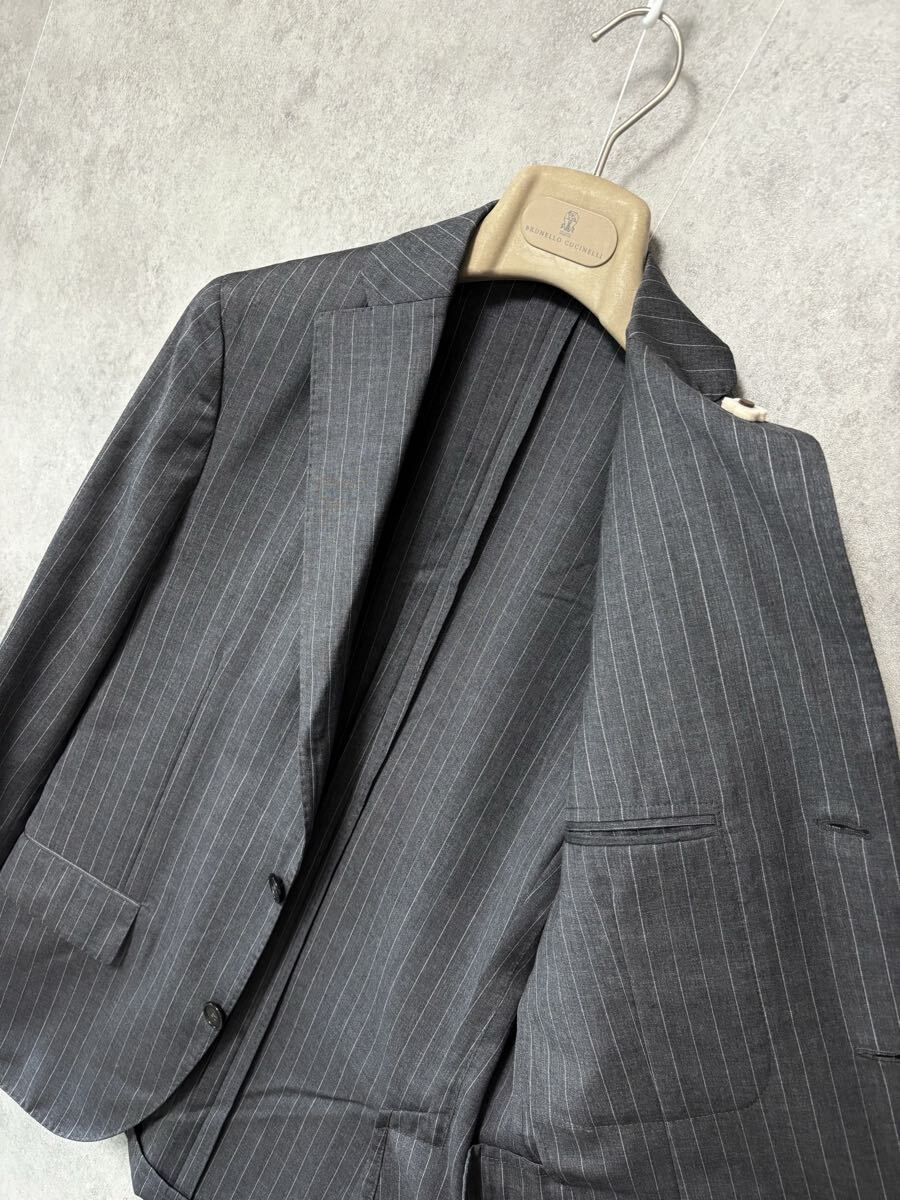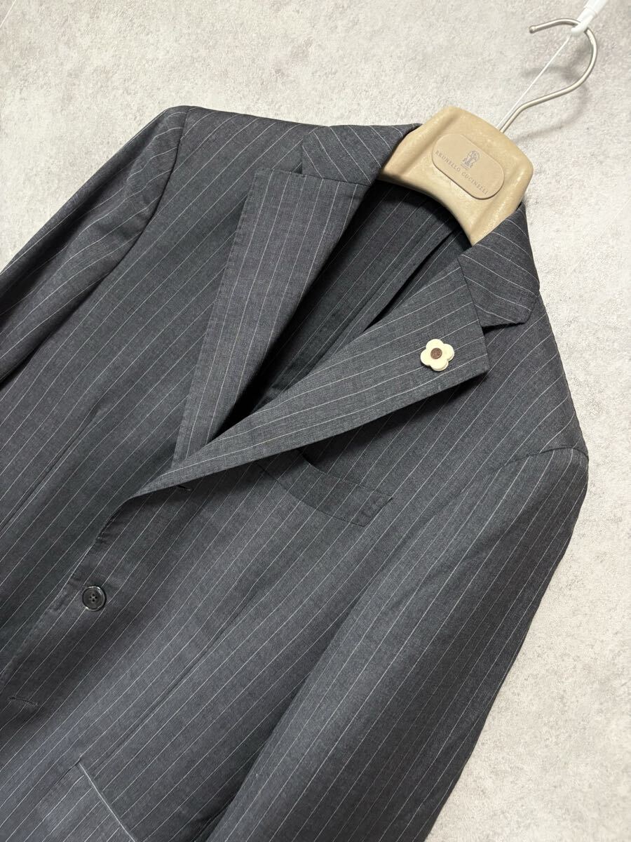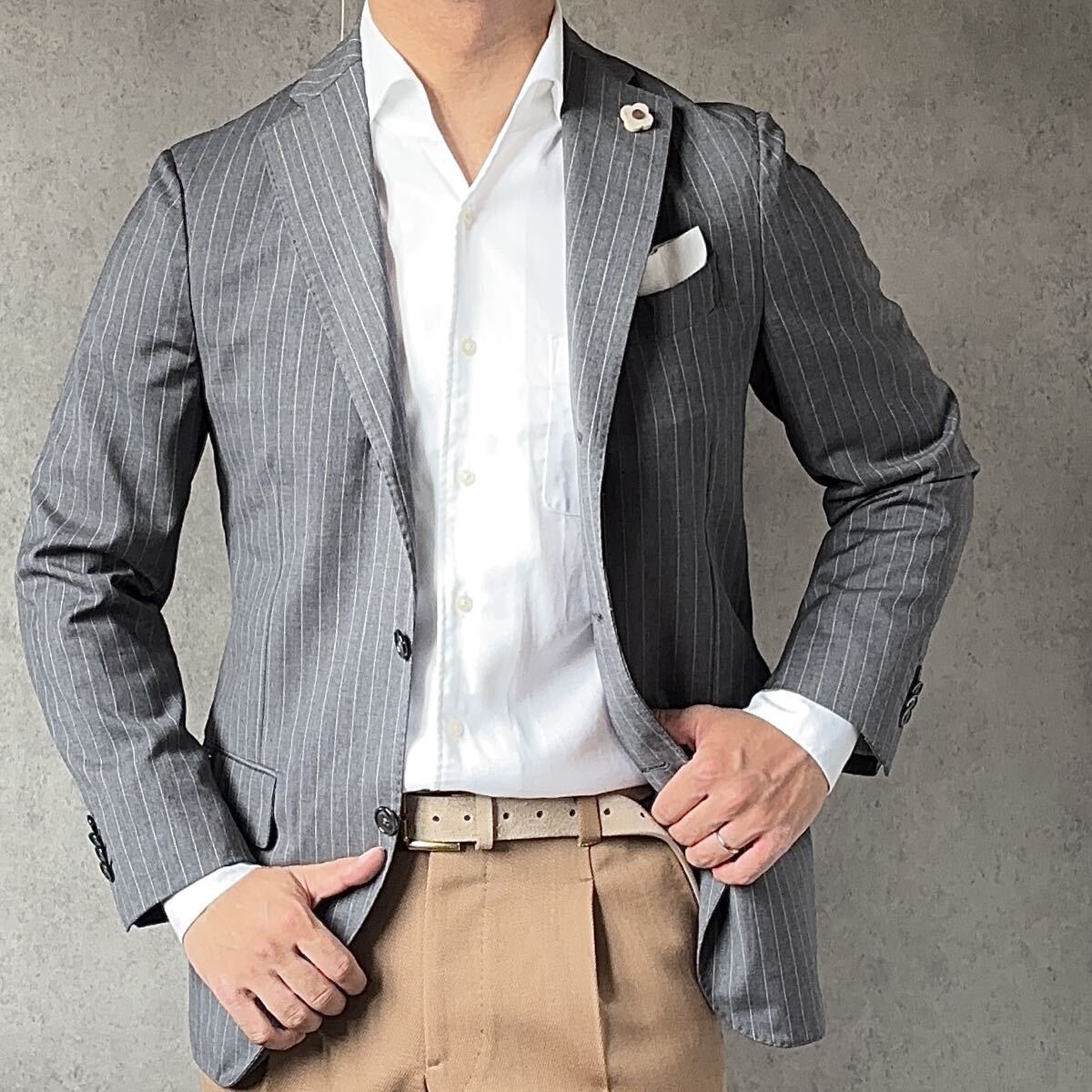 特徴は、イタリアらしいエレガンスと柔らかな構築美のバランス。クラシックでありながらも、現代的な軽やかさを感じさせる仕立ては、まさに「柔らかい構築美」と称されます。花のブートニエールを象徴に遊び心と個性を添えるデザインセンスも魅力のひとつ。