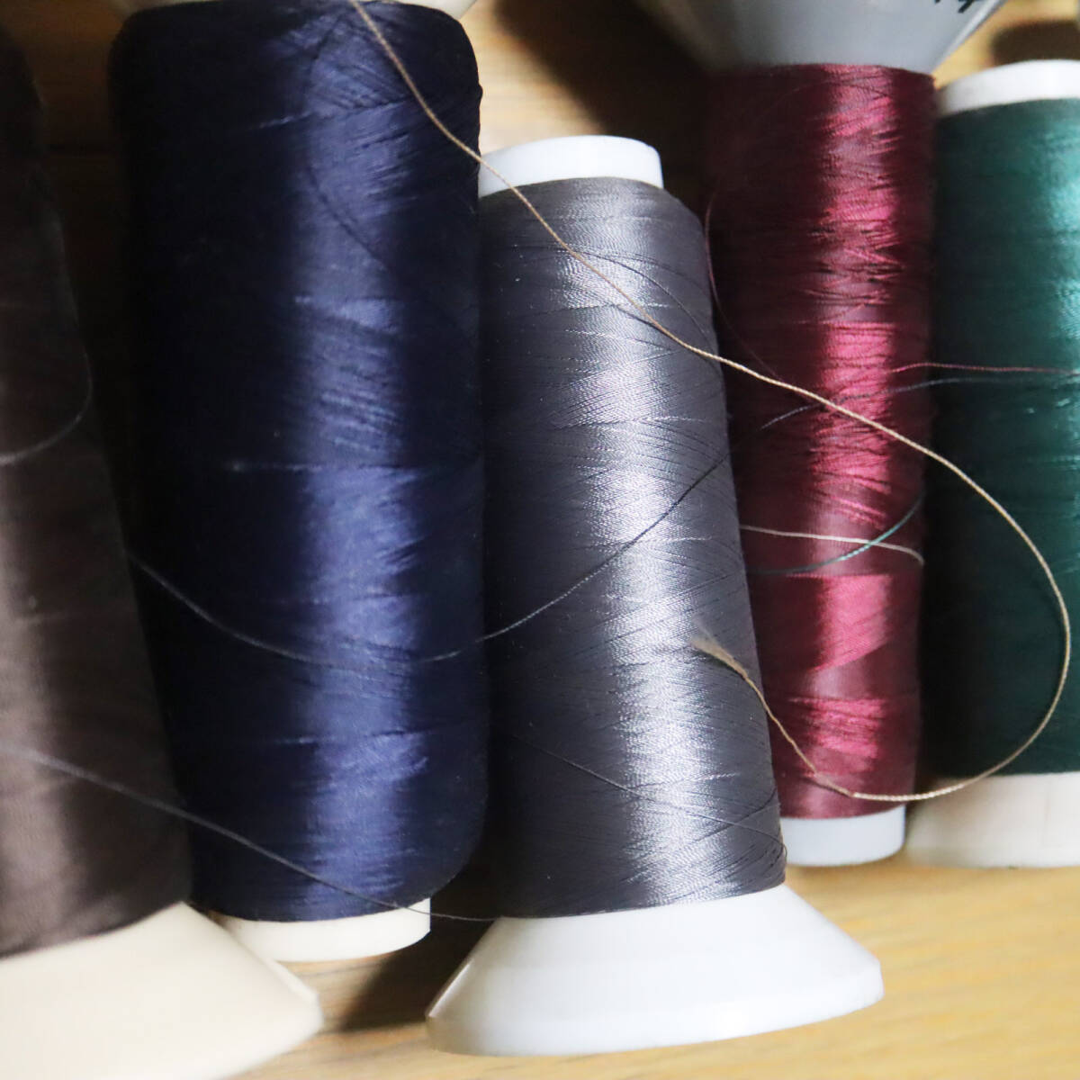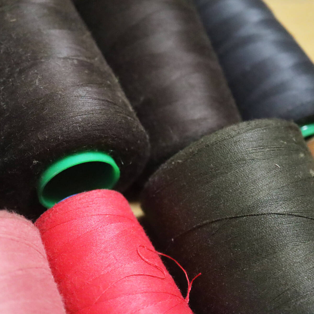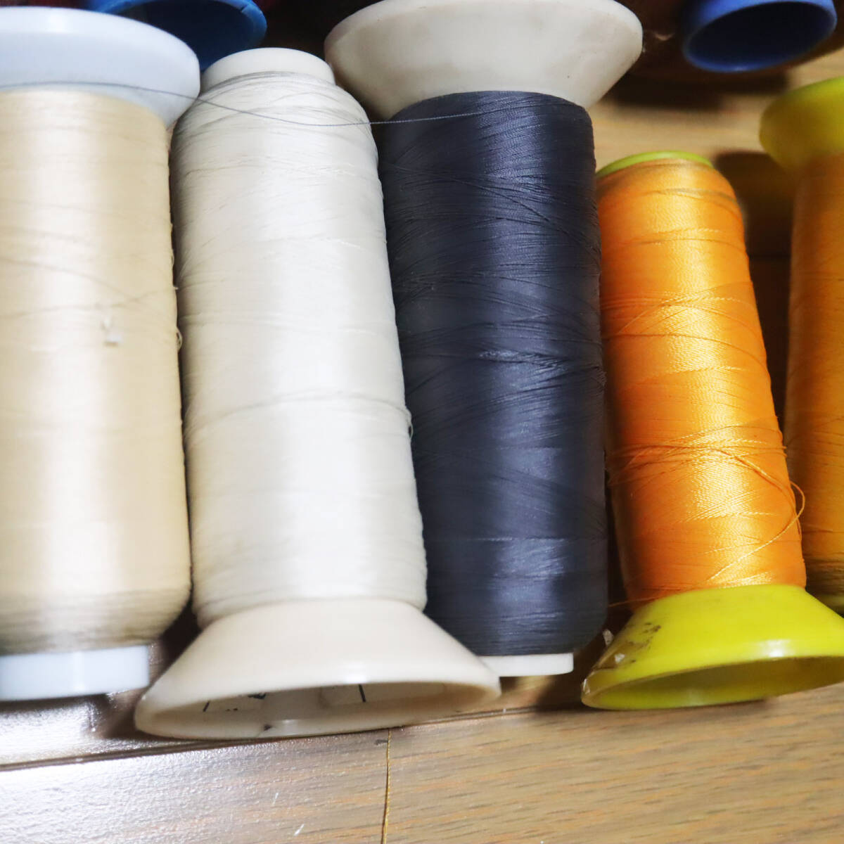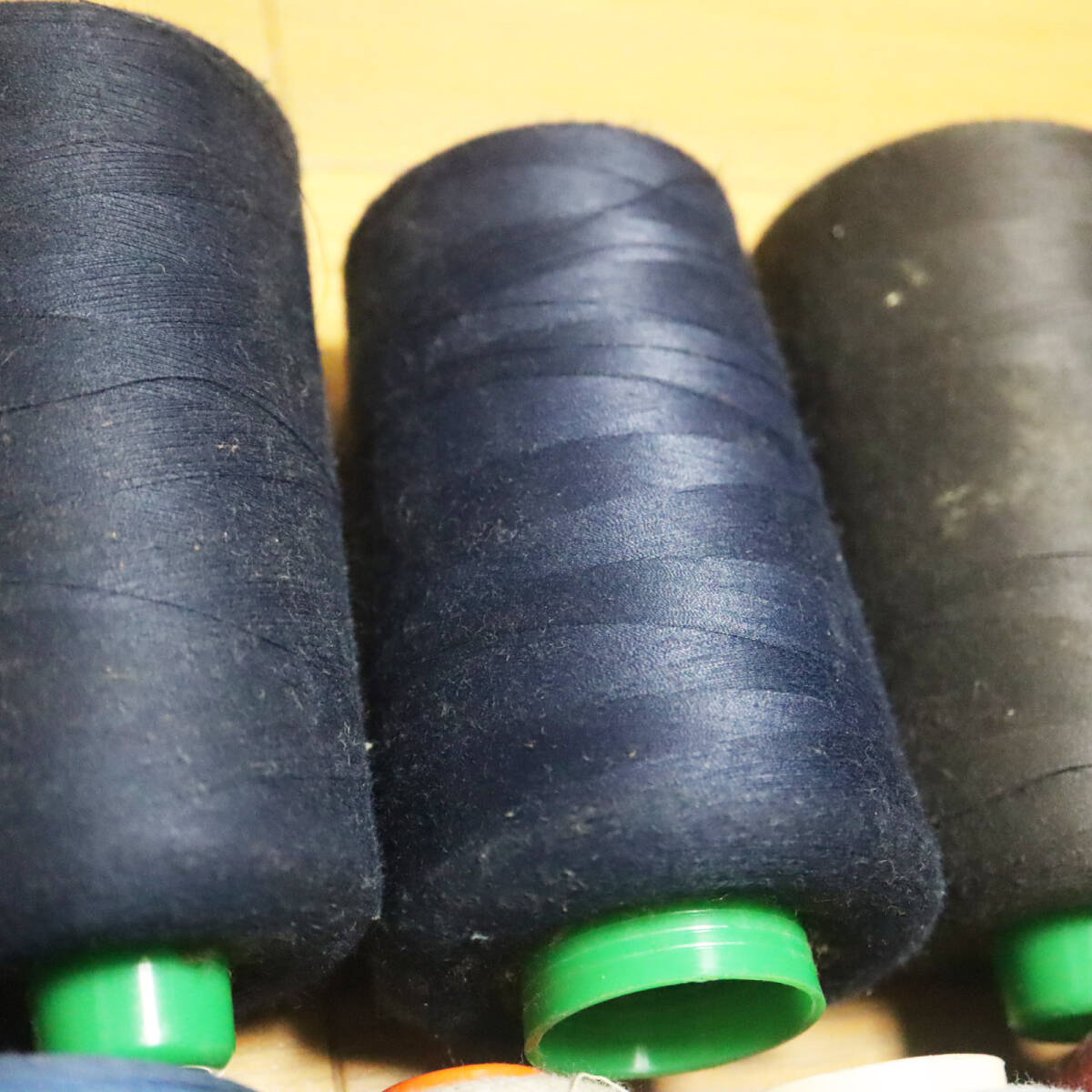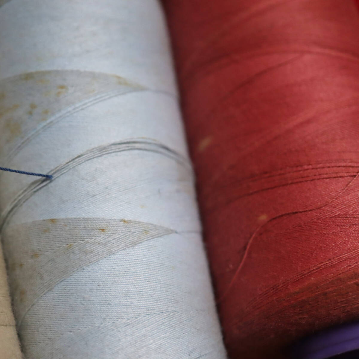 工業ミシン用糸多数 ロックミシン用糸2本 まとめて 画像の通りです。 使用したものも、使用していないものもあるかと思います。 糸の量は、2枚目の画像で確認して下さい。 上2段が光沢のない綿糸 下1段が光沢のある糸です。 ロックミシン用の糸はベージュ2本のみです。 4枚目の画像でお分かりいただけるように、汚れが目立つ糸もあります。 ご購入の際はその旨ご了承下さい。 | |||