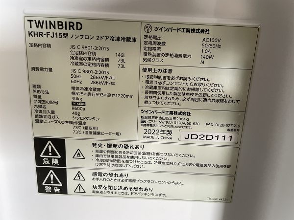 【美品】TWINBIRD 2ドア冷蔵庫 KHR-FJ15 2022年製 通電確認済み シンプル コンパクト 大容量フリーザ 新生活応援