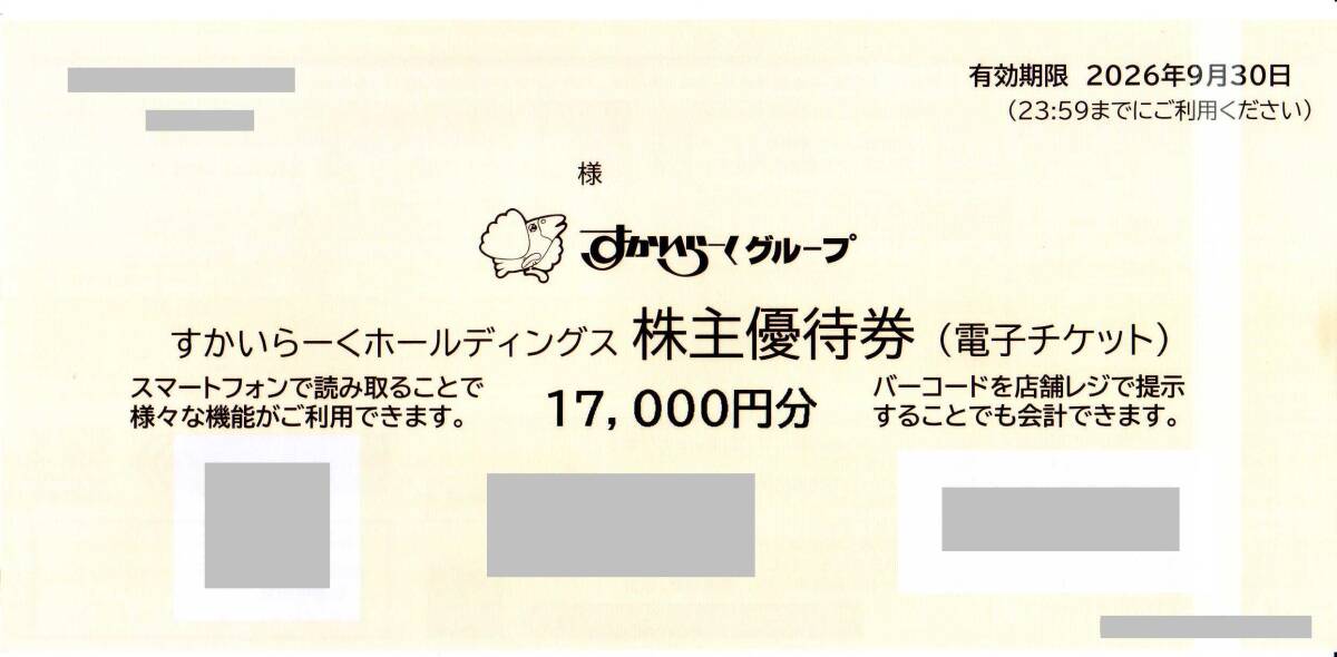 ご覧頂きありがとうございます。 商品掲載内容未確認によるトラブル防止のため、必ず最後まで掲載内容をお読み頂き、商品掲載内容にご同意の上、ご入札下さい。 ★最新 ガスト バーミヤン 資さんうどん すかいらーくホールディングス株主様ご優待券(電子チケット) 17000円券★送料無料条件有★です。 ★入札は、すかいらーくホールディングス株主様ご優待券(電子チケット)1枚(17000円券)当たりの金額でお願いします。 ◇◆商品説明◆◇ ★本券は、全国のすかいらーくグループが運営する各レストランでご利用頂けます。2025年4月1日より資さんうどんでもご利用可能になります。 ★お会計額(税込価格)から残高の範囲にて1円単位でご利用頂けます。複数枚の同時利用も可能です。 ★株主様ご優待券(電子チケット)は、スマートフォンでも、紙面でもご利用頂けます。優待券の残高をプレゼントすることも可能になりました。500円単位でプレゼントすることが可能です。 ★発送に際して、紙面上の株主番号と株主名は切り取って発送させていただきます。ご了承ください。ご利用には全く問題ありません。 ★有効期限は、2026年9月30日23:59です。 ◇◆発送方法と送料について◆◇ ★送料は、落札者様のご負担でお願いいたします。基本発送は、普通郵便(定形郵便)にて発送させて頂きます。 但し、郵便事故による不着、あるいは郵送中の損害による返金、あるいは代替商品補償の責任は負いかねますのであらかじめご了承下さい。 ご不安な場合には、追跡記録可能または損害補償対象の発送方法をお奨めいたします。なお、郵便事故が発生した場合には、出来る限りのご協力はさせて頂きます。 また、郵便配達サービス変更に伴い、土曜日配達の中止、お届け日数の繰り下げが実施されています。普通郵便・特定記録郵便の場合、到着まで時間を要する場合がございます。 あらかじめご了承頂くとともに余裕をもったご対応を頂きますようにお願いいたします。 ●普通郵便(定形郵便)は110円(発送重量50gまで)(損害補償対象外)(土曜日・日曜日・休日配達中止) ●特定記録郵便は、普通郵便(定形郵便)+210円(追跡記録可能)(損害補償対象外)(土曜日・日曜日・休日配達中止) ●速達郵便は、普通郵便(定形郵便)+300円(損害補償対象外)(土曜日・日曜日・休日配達実施) ●書留郵便は、普通郵便(定形郵便)+480円(追跡記録可能)(損害補償対象)(土曜日・日曜日・休日配達実施) ●簡易書留郵便は、普通郵便(定形郵便)+350円(追跡記録可能)(損害補償対象)(土曜日・日曜日・休日配達実施) ●レターパックプラスは600円・レターパックライトは430円(追跡記録可能)(損害補償対象外)(土曜日・日曜日・休日配達実施) ●スマートレターは210円(損害補償対象外)(土曜日・日曜日・休日配達中止) ★発送方法については、普通郵便(定形郵便)・特定記録郵便・速達郵便・簡易書留郵便・書留郵便・ゆうパック(損害補償対象)(土曜日・日曜日・休日配達実施)・ クロネコ宅急便(損害補償対象)・レターパック(プラス・ライト)・スマートレター等、落札者様のご希望発送方法に対応いたします。 但し、ミニレター(郵便書簡)、クリックポストについては対応いたしかねますのであらかじめご了承ください。 ★即決価格でご落札された場合には、普通郵便(定形郵便)に限り出品者が送料を負担いたします。 また、即決価格の90%以上でご落札された場合には、普通郵便(定形郵便)に限り出品者が送料の50%を負担いたします。 但し、即決価格、あるいは即決価格の90%以上でご落札された商品を普通郵便(定形郵便)以外の発送方法でご希望される場合、送料は落札者様全額ご負担とさせて頂きます。 あらかじめご了承下さい。 なお、即決価格、あるいは即決価格の90%以上でご落札された商品と同梱発送をご希望される場合、送料は落札者様全額ご負担とさせて頂きます。あらかじめご了承下さい。 ◇◆備考・その他◆◇ ●誠実、迅速に対応いたしますので、よろしくお願いいたします。 ●自己紹介欄もどうぞご覧下さい。 ●他にも多数出品しておりますのでどうぞご覧下さい。 ●ご落札から48時間以内に落札者様情報のご連絡を必ずお願いいたします。 ご連絡を頂けない場合には、お取引の意思がないと判断させていただき、落札者様のご都合により即キャンセルとさせて頂きます。十分にご留意下さい。 また、落札者様情報のご連絡があるまでは、取引メッセージによるご質問等には一切ご回答いたしかねますのであらかじめご了承下さい。 ●落札者様情報のご連絡を頂いた後、落札者様から何もご連絡がなく、ご落札から72時間以内にご決済頂けない場合には、 落札者様のご都合により即キャンセルとさせて頂きます。十分にご留意下さい。 また、落札者様からご連絡があった場合でも、かんたん決済支払期限を超過した場合は、落札者様のご都合により即キャンセルとさせて頂きます。 なお、この場合、出品者にて商品を削除させて頂く際、落札者様の評価に対して「非