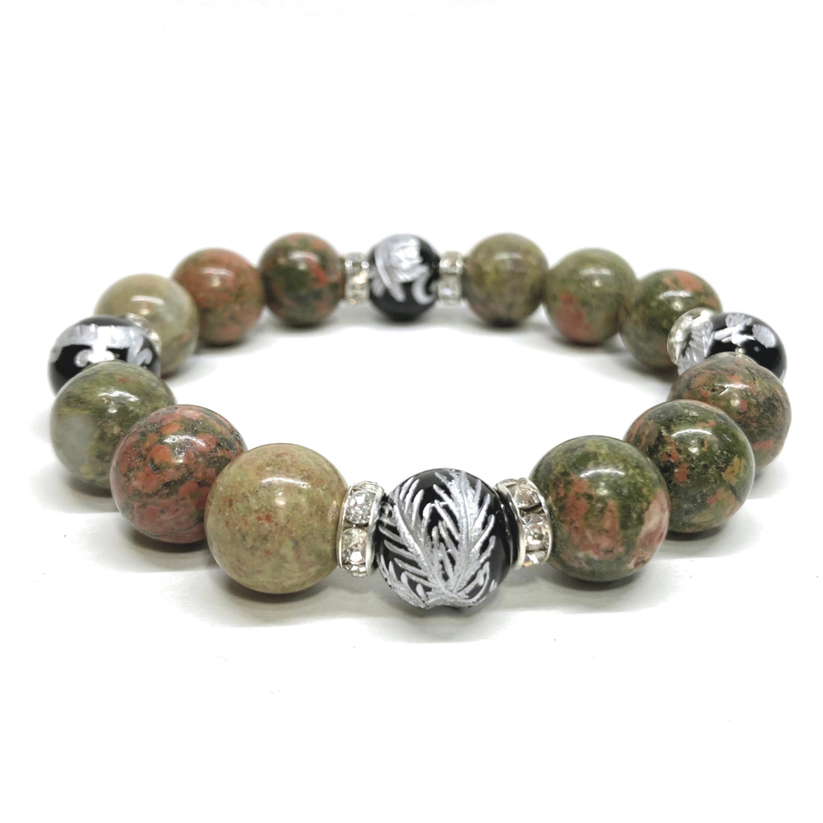 こちらは、四神獣銀彫オニキとユナカイトを組み合わせたパワーストーンブレスレットです。四神獣は、中国の伝説で4つの方向(東西南北)を守護する神聖な神。四神獣、厄災から身を守り、多くの運気を呼び込むと言われております。石大きさは程よくインパクトのある12mm玉で内周 約17cmです。 数に限りがございますので気になる方はお早めにどうぞ。