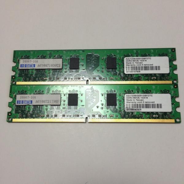★商品説明★ | 取引トラブルを防ぐ為、必ずこちらへアクセスして下さい。 写真は使い回しとなりますので、実際にお送りするものはラベル・チップ等が異なる場合も御座います。 ■仕様一覧 デスクトップPC用メモリー ※メーカー:I-O DATA ※状態:中古品 ※容量:1GB ※メモリータイプ:DDR2-667 ※チップ規格:PC2-5300 ※数量:2枚 ご注意:こちらの商品は動作確認済となりますが、パソコンとの相性は保証致しませんので、よく適用機種をご確認の上、ご購入をご検討下さい。 相性保証の商品につきましては、メールにてお気軽にお問い合わせ下さい。 | |