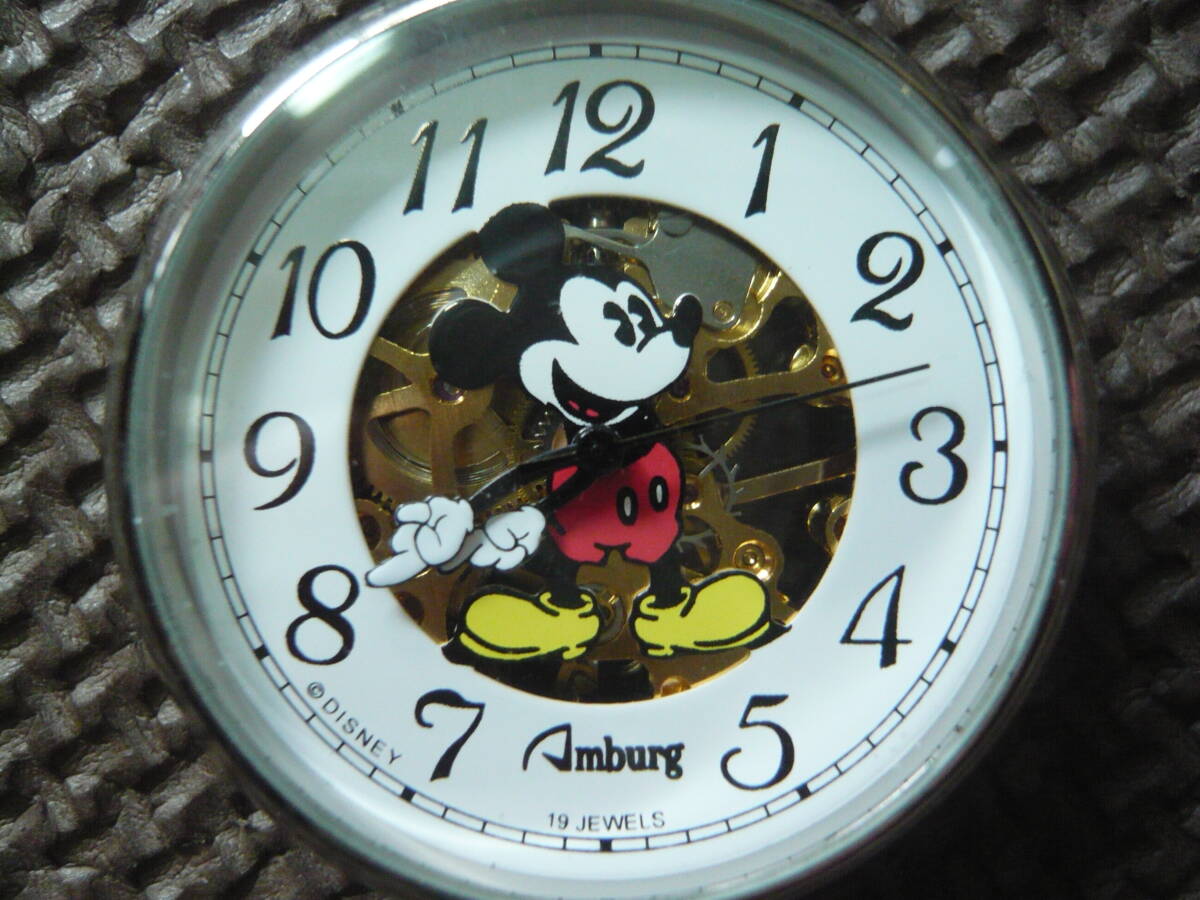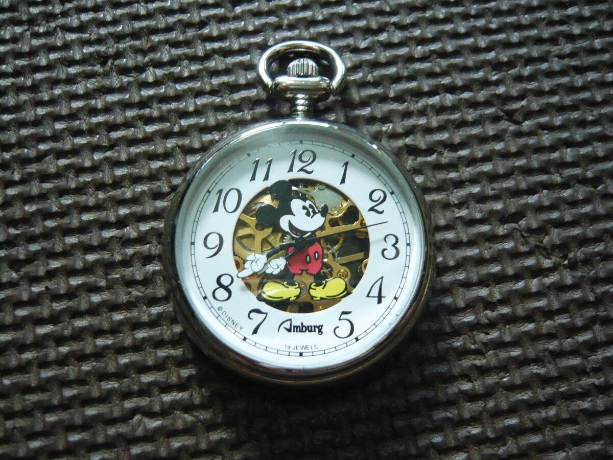 Amburg ミッキーマウス ホワイト文字盤 手巻 懐中時計 スケルトン 可動品です。直径45mm 重量44g 19Jewels 特筆すべき問題点はないと思いますが入手後年数が経過していますのでご理解の上入札お願いします。気になる方は入札ご遠慮ください。ノークレームノーリターンでお願いします。