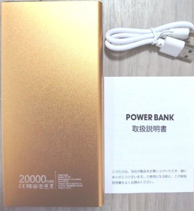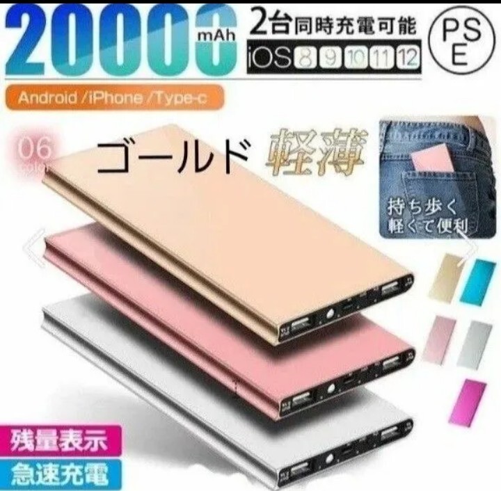 モバイルバッテリー 大容量20000mAh 急速充電薄型 軽量 2台同時充電可能 LEDライト付き PSE認証 色 ゴールド (実物写真参照)