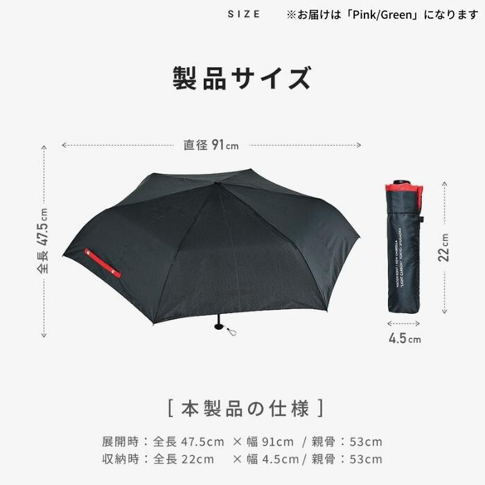 | サイズ | (約)親骨:53cm、全長:47.5cm、直径:91cm 個装サイズ:4.5×4.5×22.0cm |