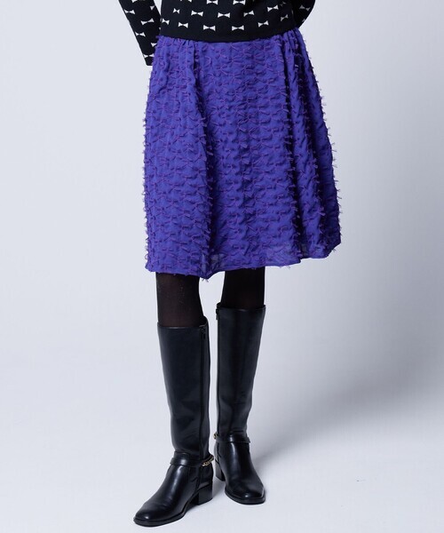 とてもキュートなリボン見えのTOCCAオリジナルジャカードのスカートです。トレンド感のある表情をしたふわふわしたファブリック。ストライプ状に配置して、細見えが叶います。