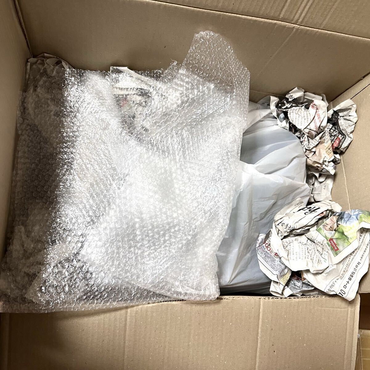 商品が形崩れしないよう新聞紙を詰め、ビニール袋+段ボールに詰めるだけの簡易梱包での発送となります。