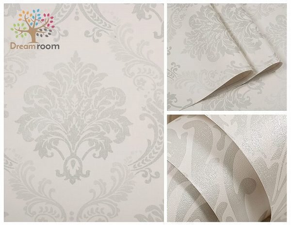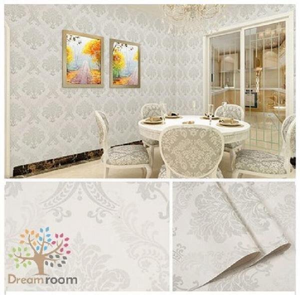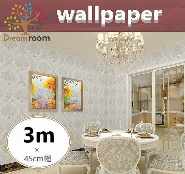 【 3m 】 ダマスク柄 白×シルバー 壁紙 45cm幅 アンティーク ウォールペーパー北欧風 インテリア リビング はがせる シール DIY 糊付き