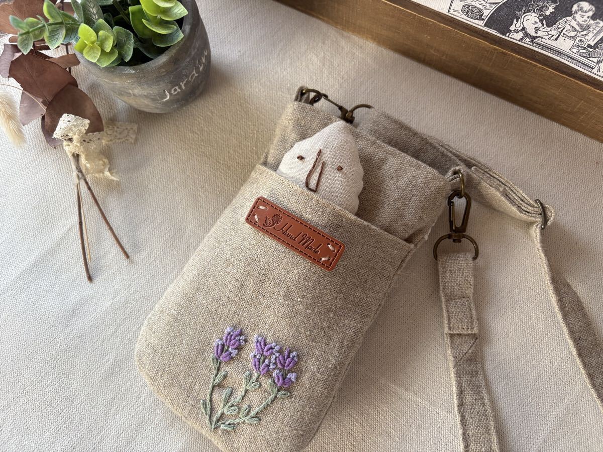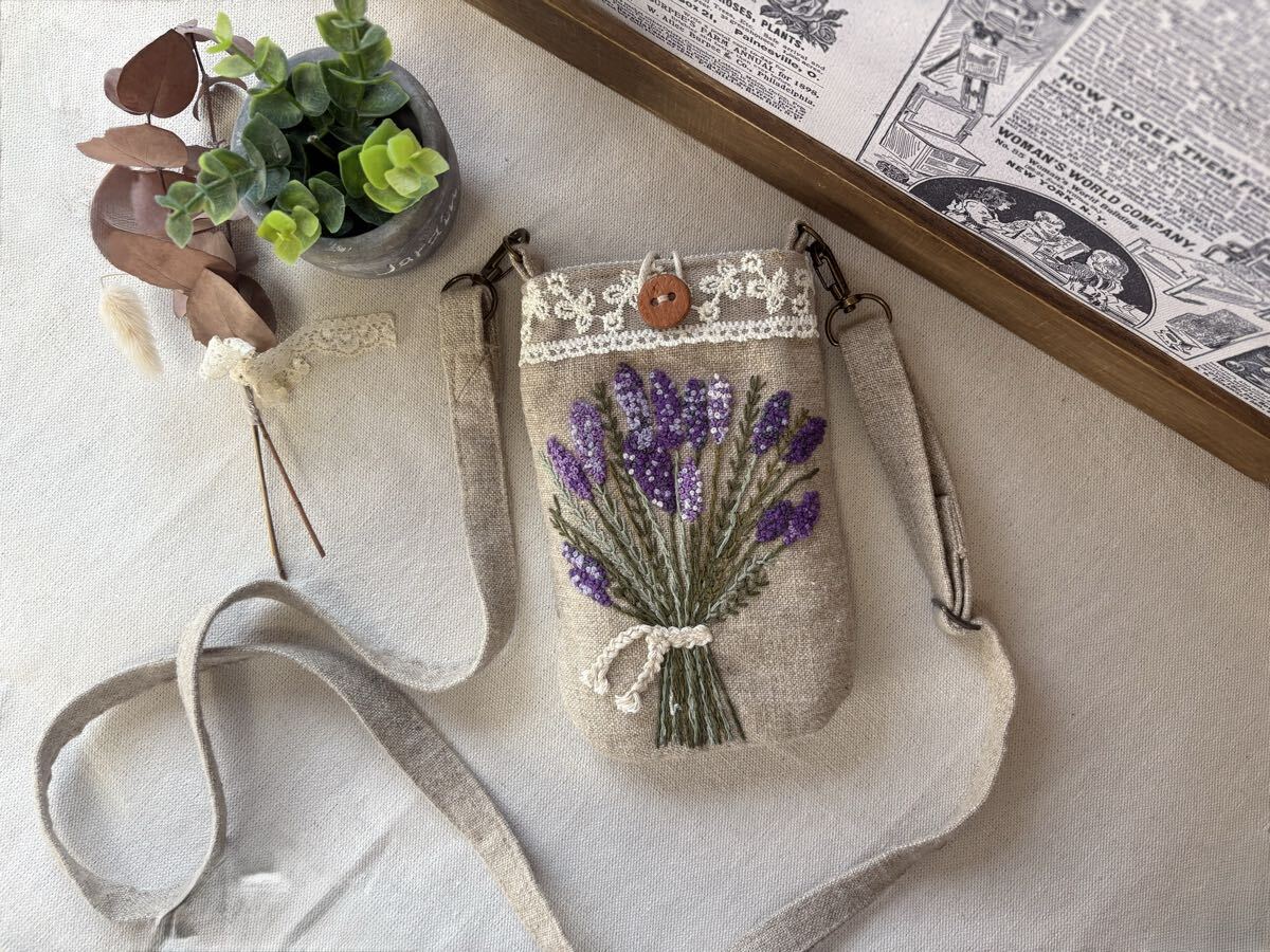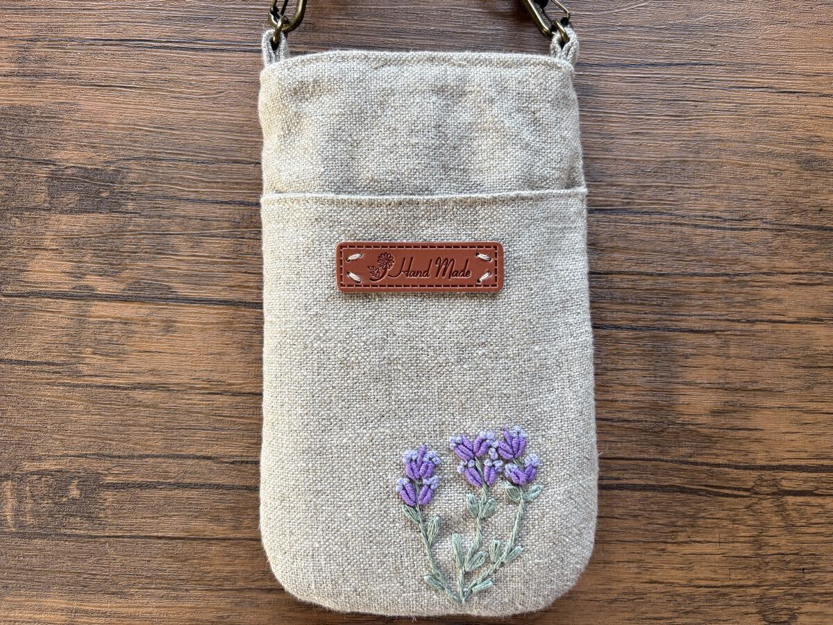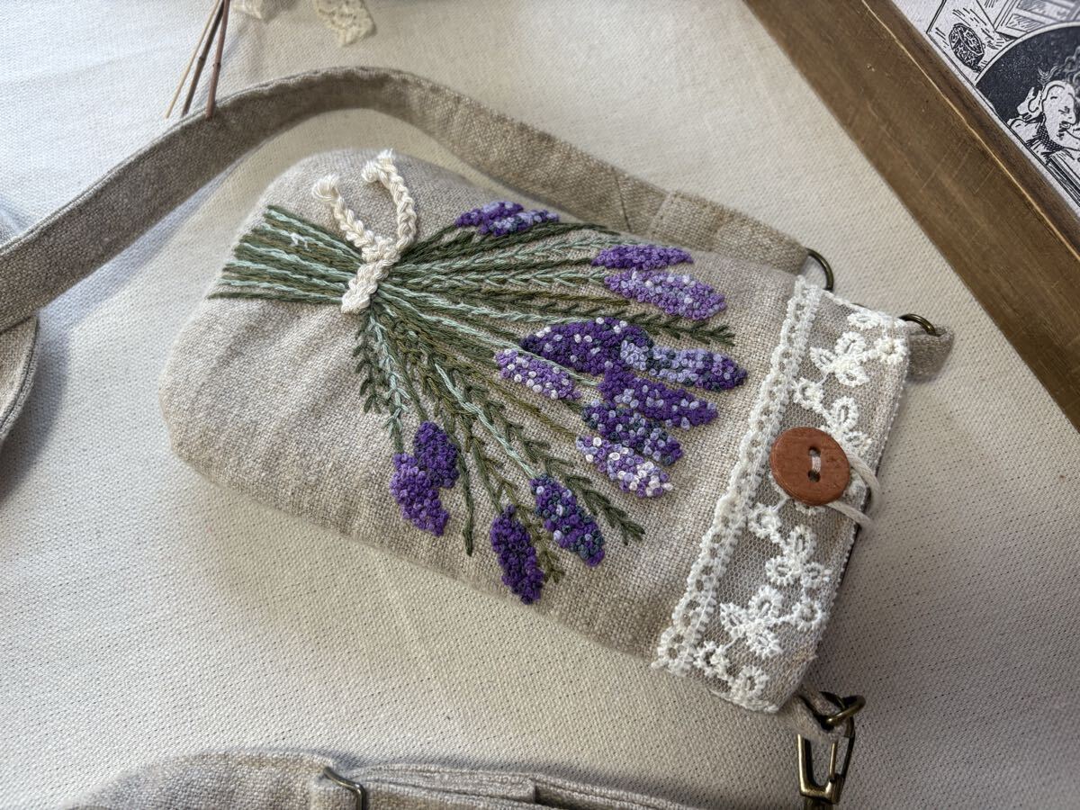 リネン100%の生成りの柔らかい素朴な風合いに鮮やかなパープルラベンダーで刺繍しました。