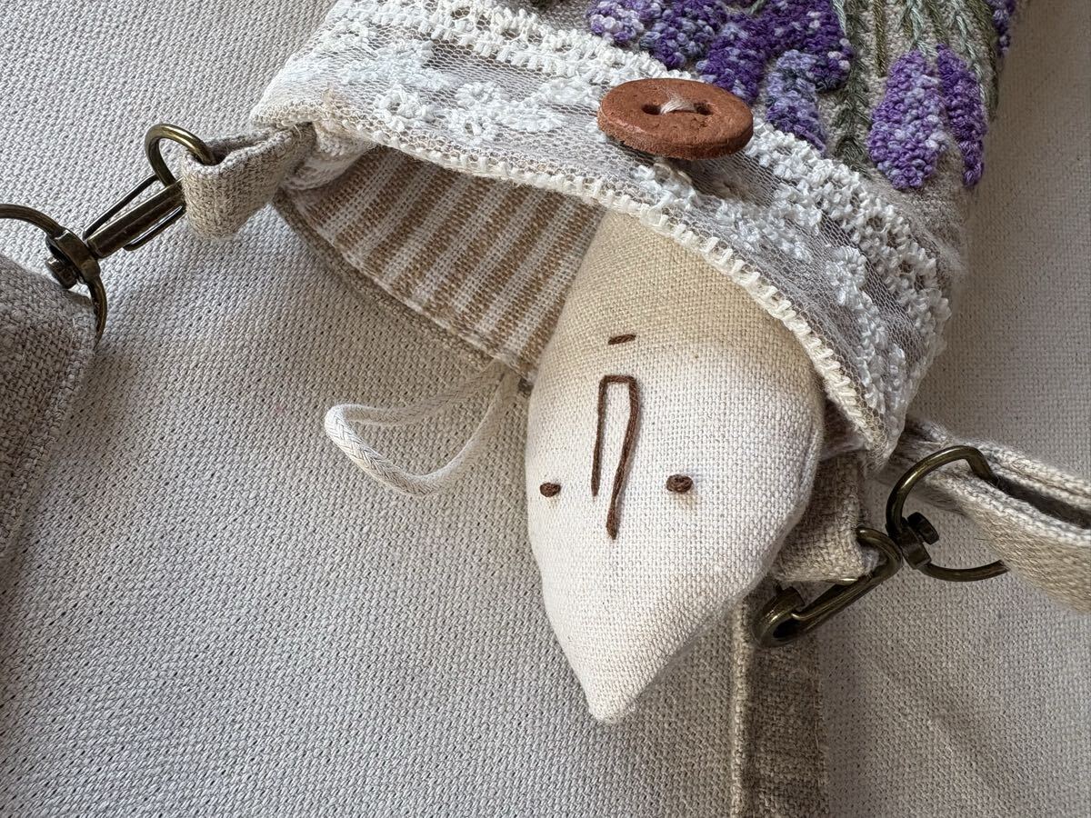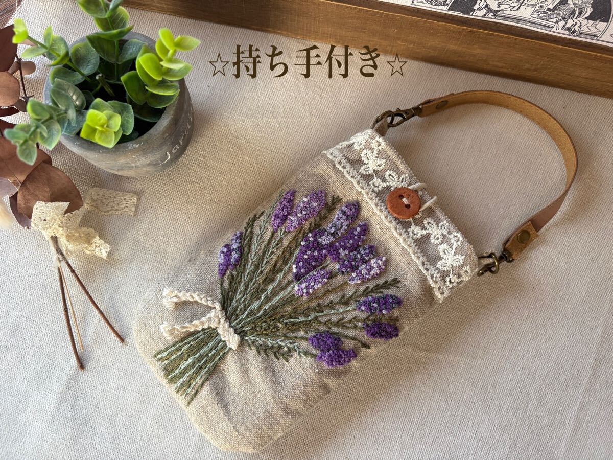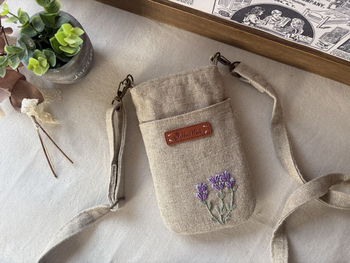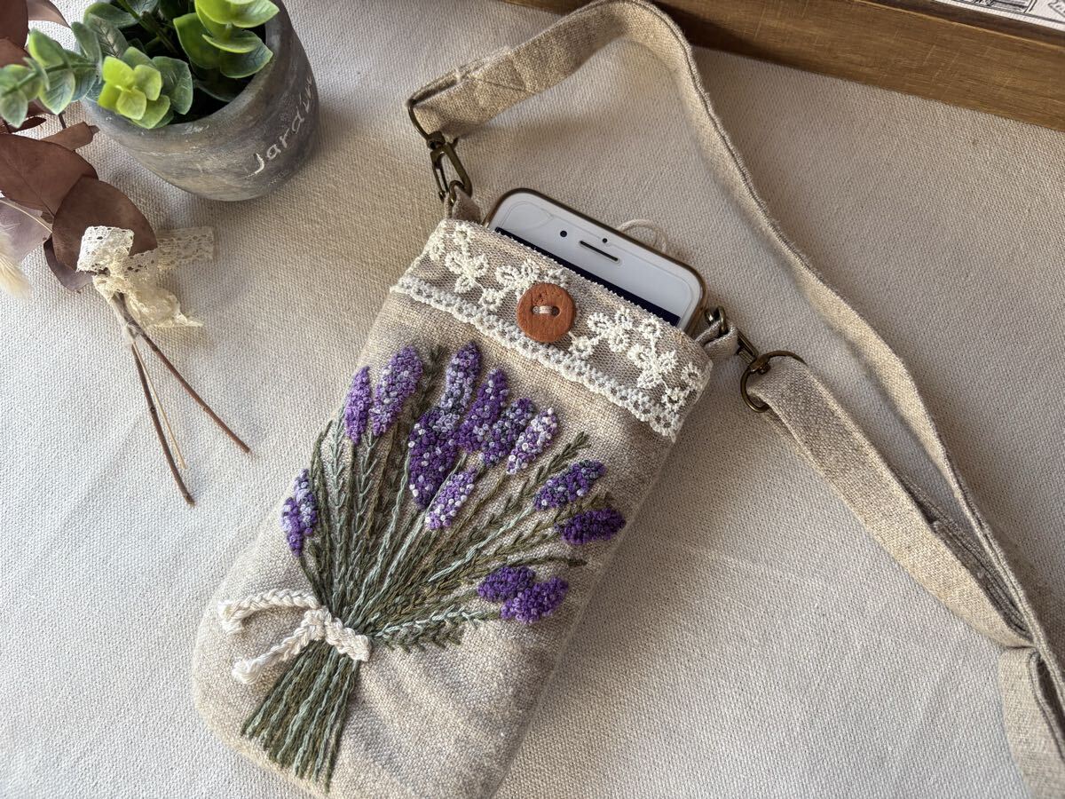 リネン100%の生成りの柔らかい素朴な風合いに鮮やかなパープルラベンダーで刺繍しました。