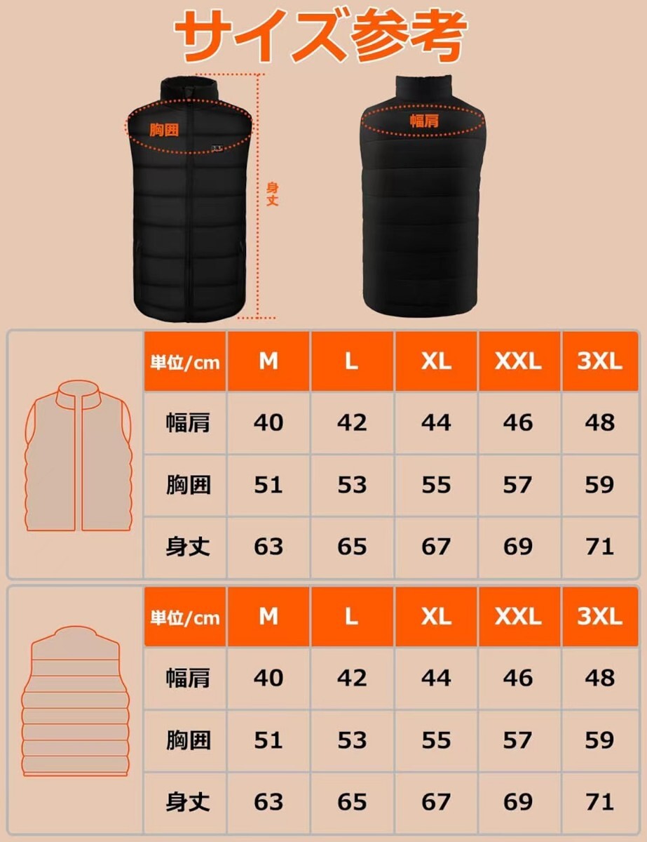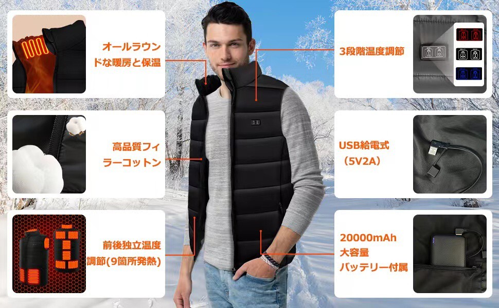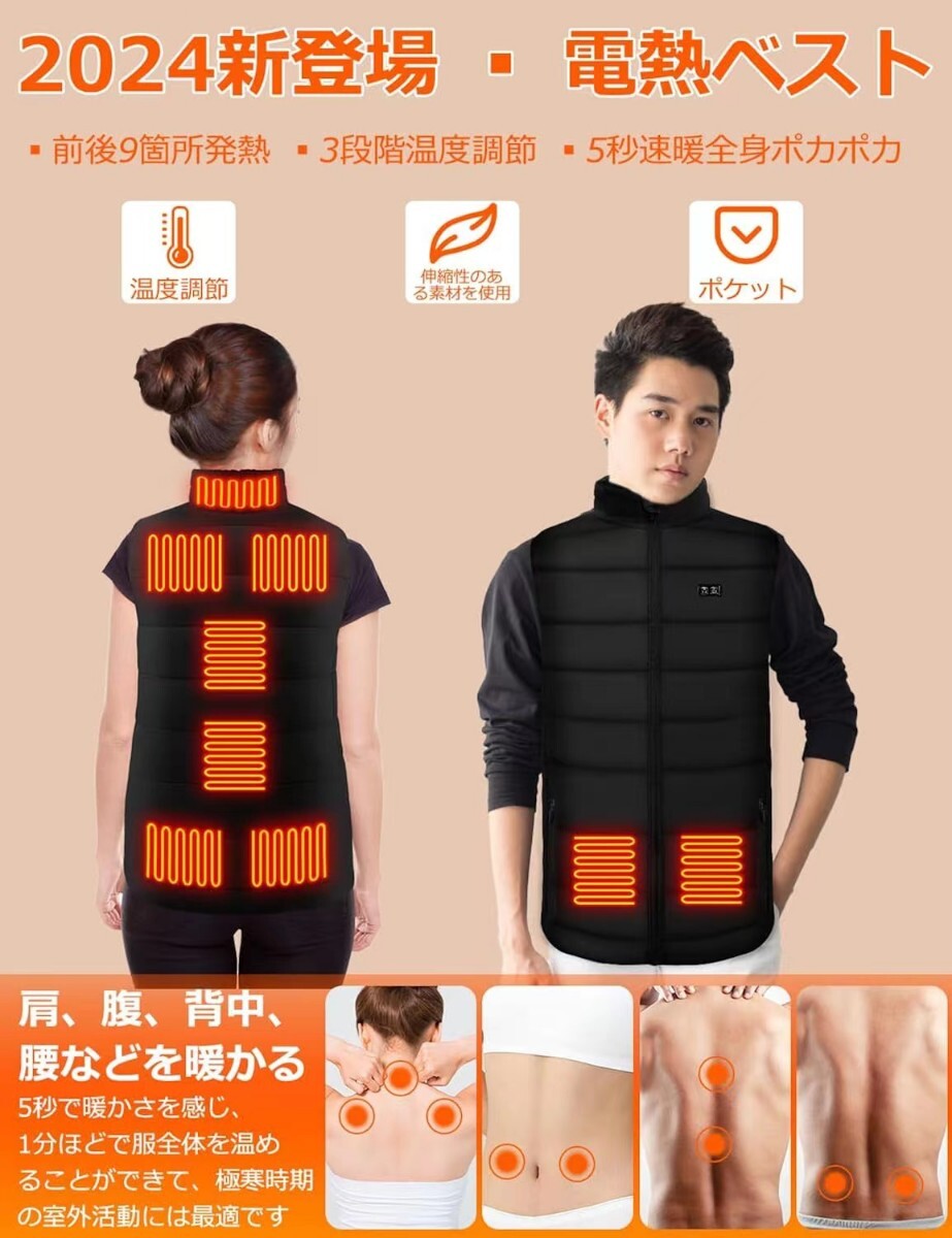 【前後9箇所発熱 ヒーターベスト】前に2つ、後ろに7つのヒーターが内蔵され、9箇所を効率よく温まり、寒い季節でも暖かく過ごす電熱ベスト。着る暖房のように冷えやすい体をじんわりと温めてくれて、冬の通勤通学、自転車/バイク運転、釣り、スポーツ観戦、スキー、登山、屋外作業など、普段使いから、アウトドア活動やお仕事まで幅広く活躍し、寒さが厳しい冬場を乗り越えるのに最適な防寒アイテムです。